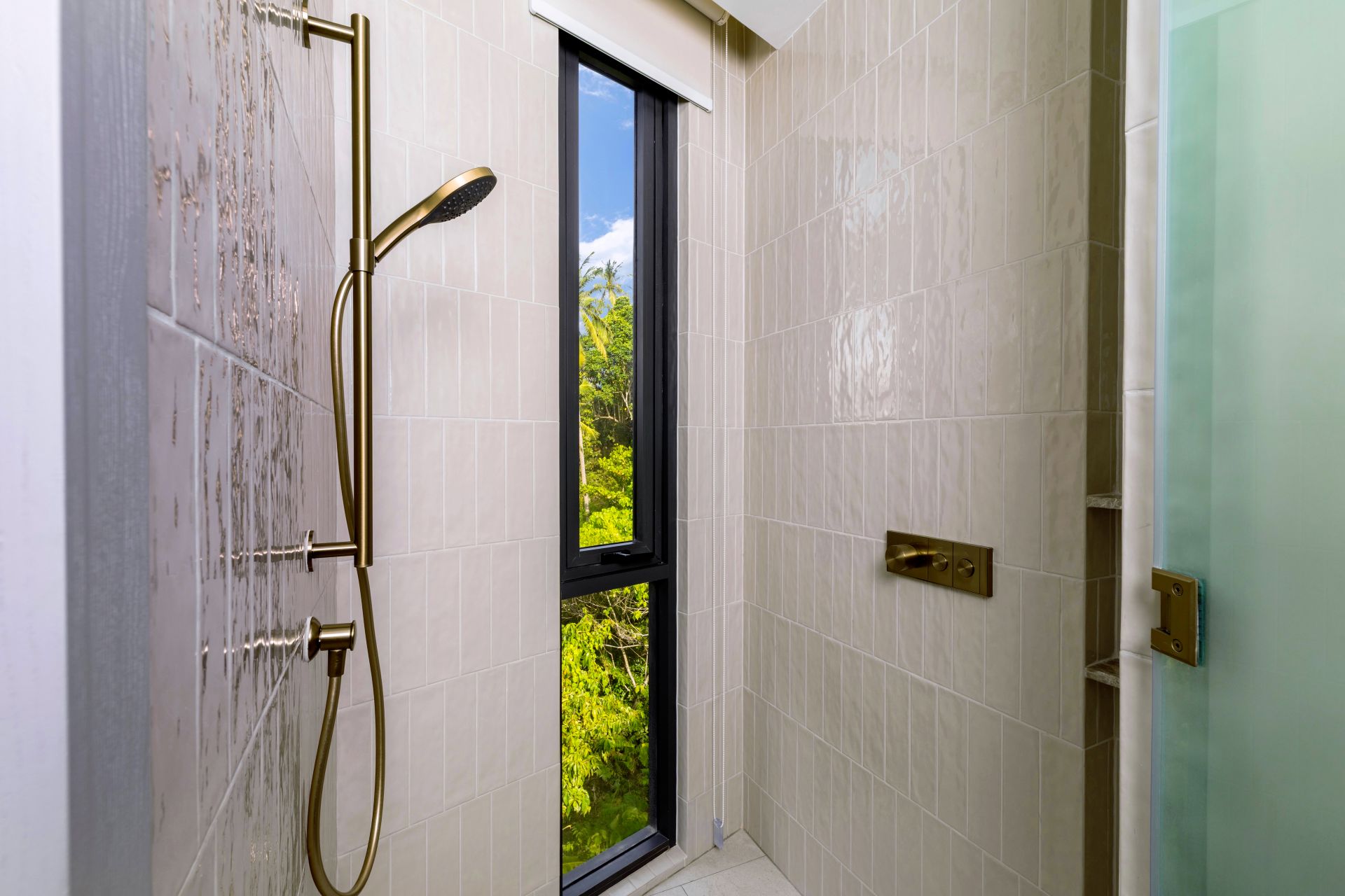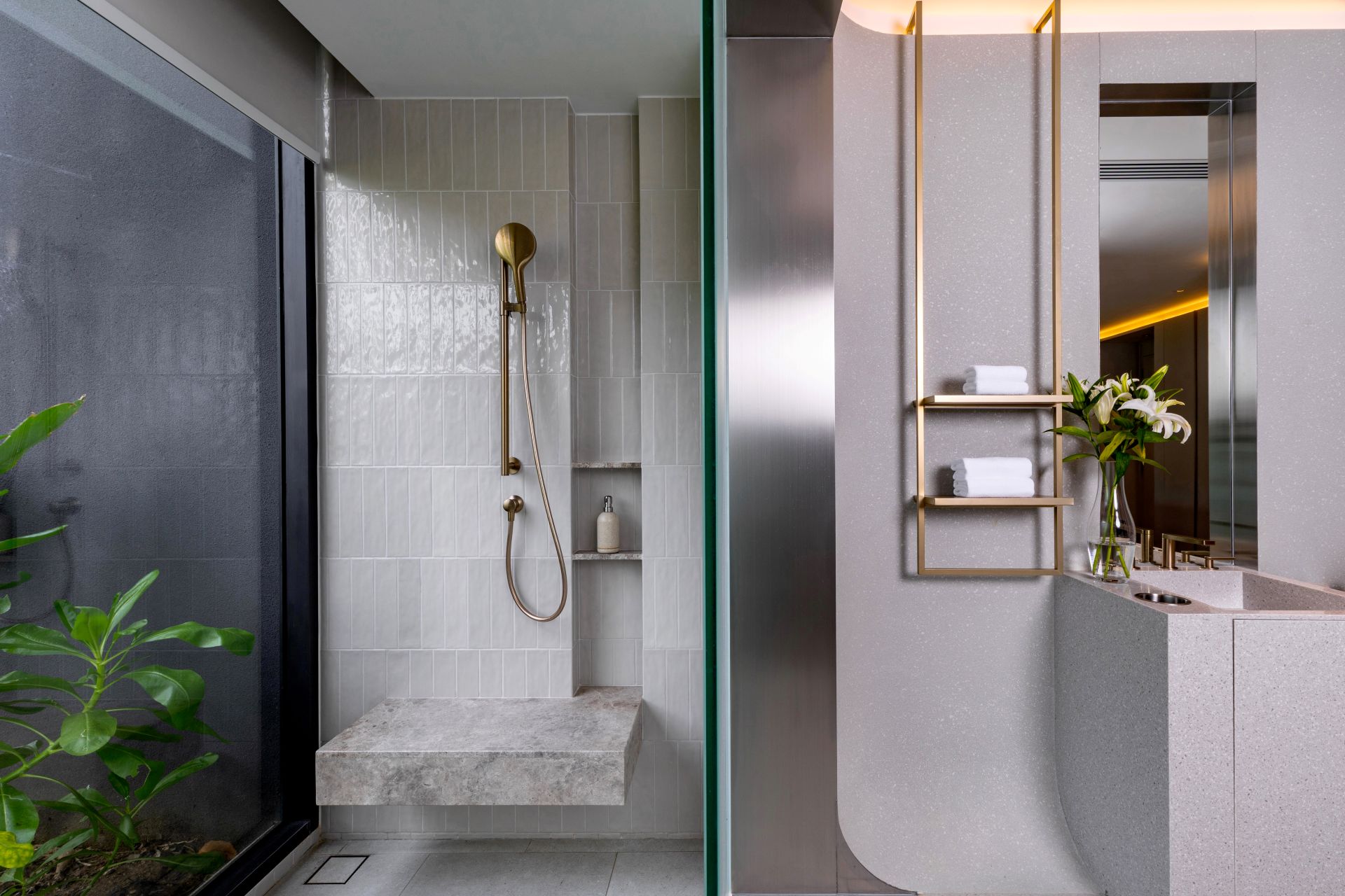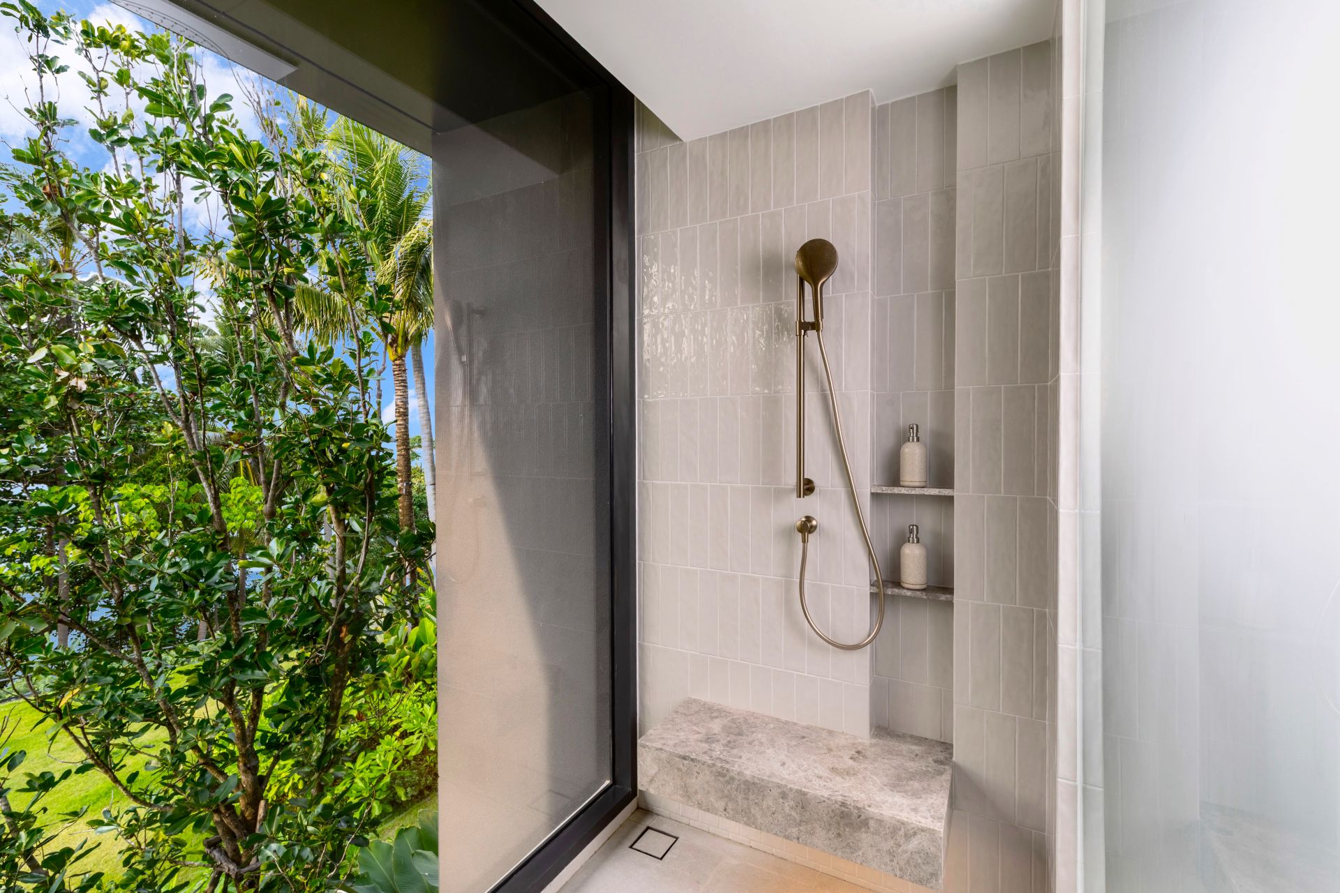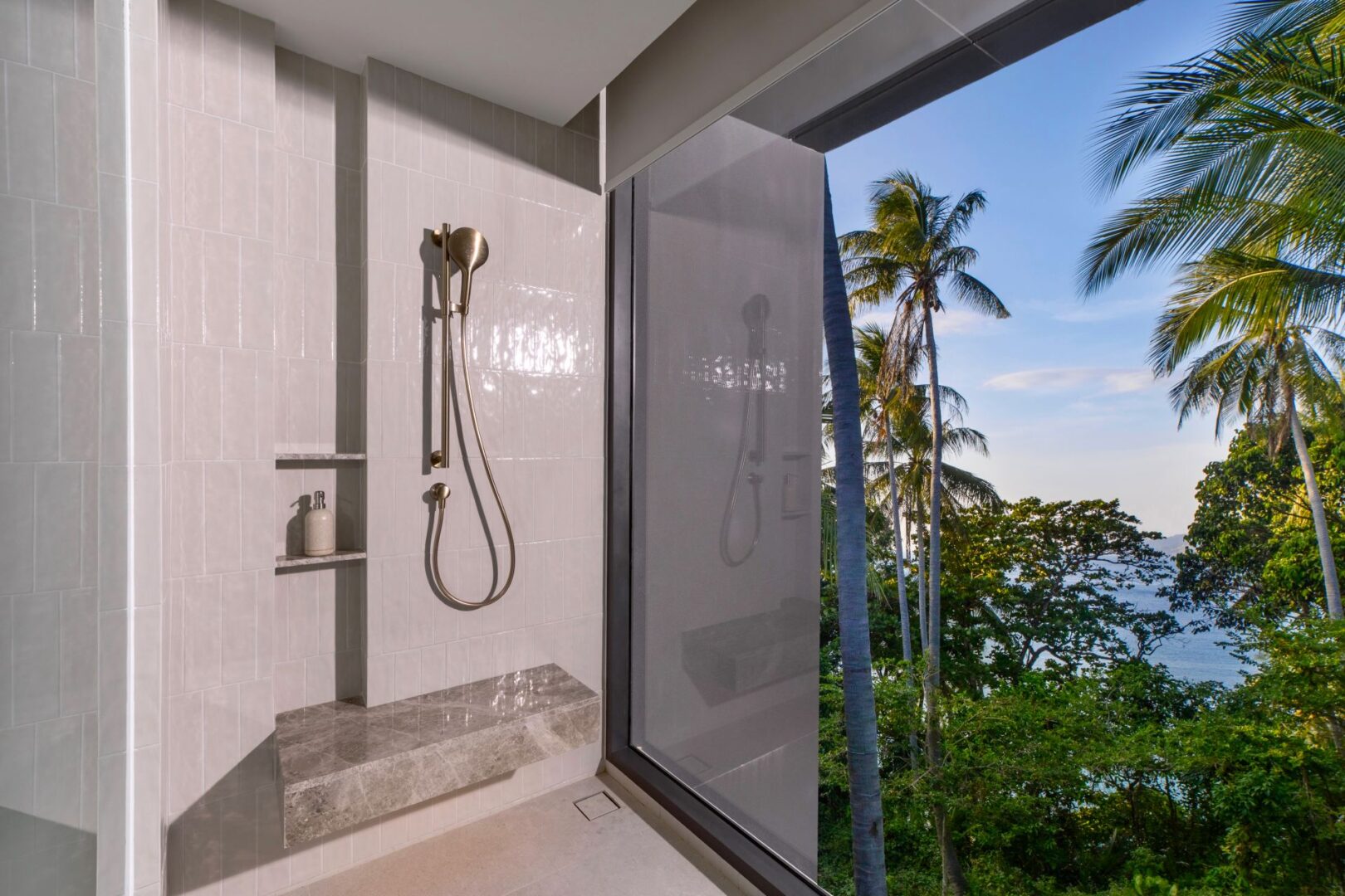 Guest Bedroom 7 (41 sqm) — Panoramic sea view; 2 single size beds or 1 Emperor-size bed; Balcony with outdoor table and chairs; 43-inch Smart TV; Closet; Safety box; Air conditioning; Ceiling fan; Minibar; Telephone; Working table and chair; Ensuite bathroom with bathtub, Grohe rain shower, Kohler shower, Powder room with Toto Neorest Smart Toilet and double vanities; Clothes drying rack; Toiletries; Hairdryer; Bathrobes; Slippers; Beach bag; Laundry bag; Umbrella
