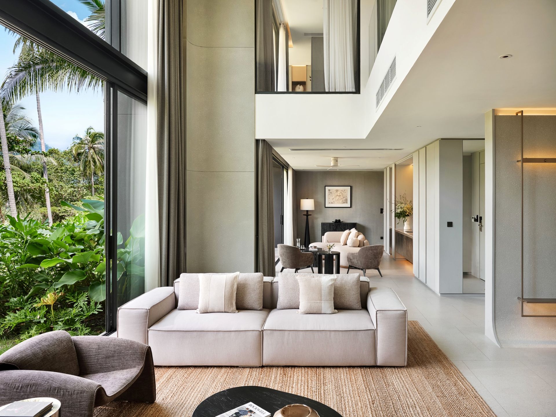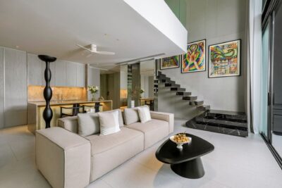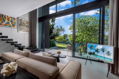 Duplex Bedroom 2 (102 sqm) — Panoramic sea view; Emperor-size bed; Balcony with outdoor table and chairs; 43-Inch Smart TV; Sofa and Coffee Table; Pantry with Sink; Work island with 2 chairs; Minibar; Telephone; Powder room with Toto Neorest Smart Toilet and vanity (lower level); Closet; Safety box; Air conditioning; Ceiling fans; Ensuite bathroom with Grohe rain shower, Kohler rain shower, Powder room with Toto Neorest Smart Toilet, Double vanities; Clothes drying rack; Toiletries; Hairdryer; Bathrobes; Slippers; Beach bag; Laundry bag; Umbrella