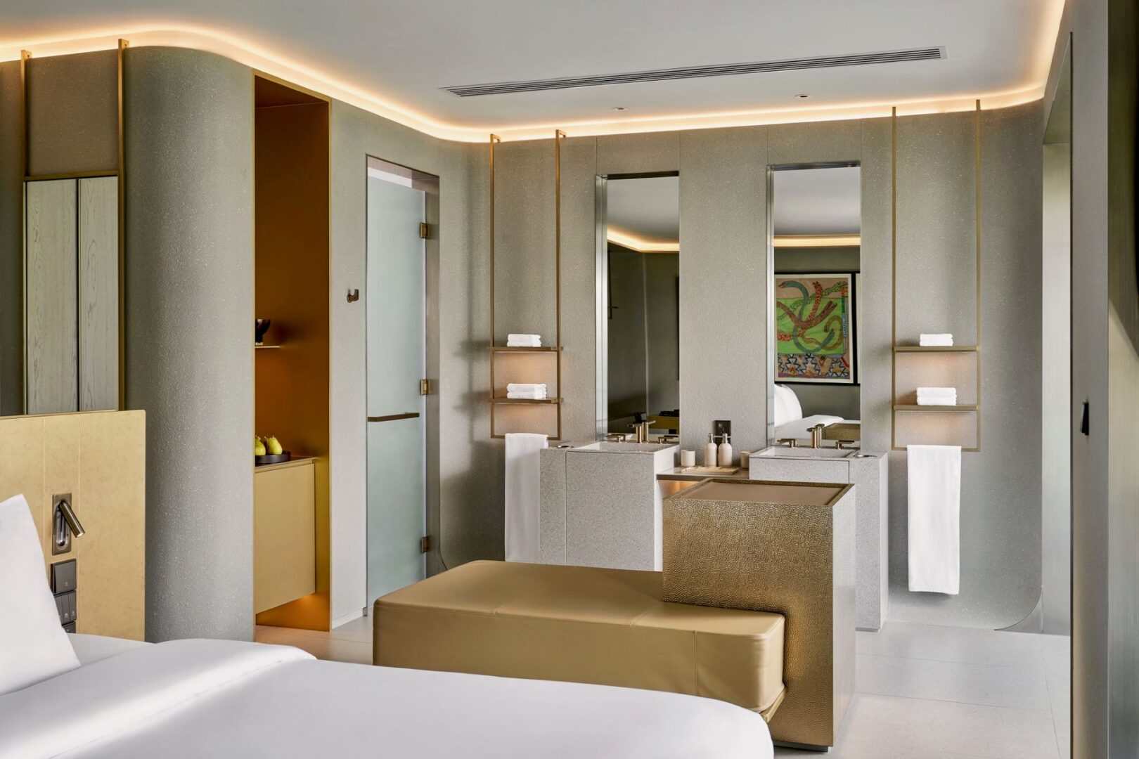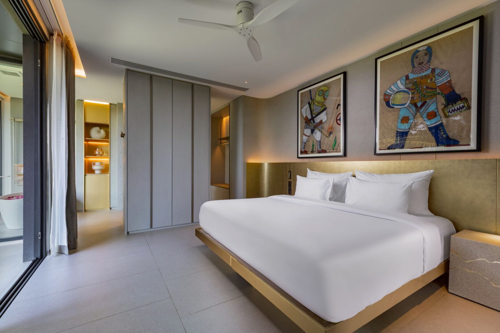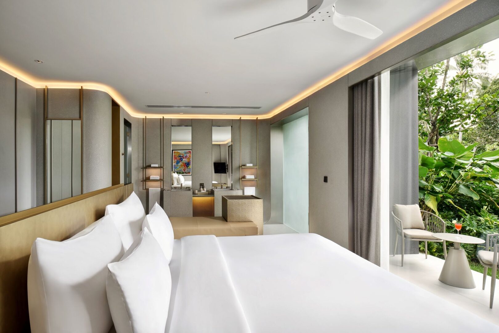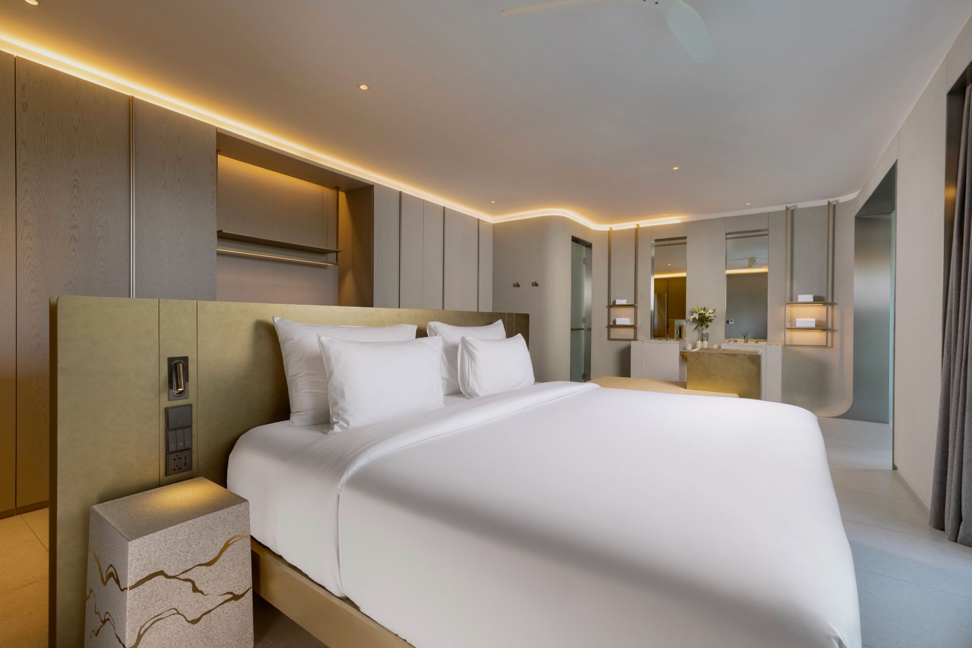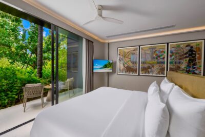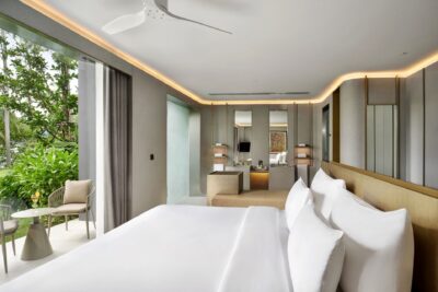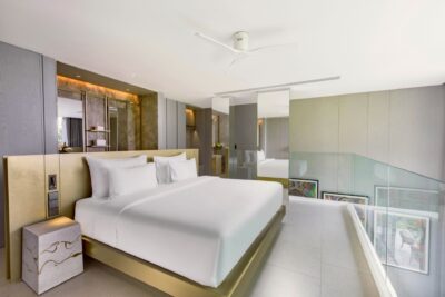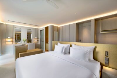 Bedroom: Emperor-size bed; Balcony with outdoor table and chairs; 43-inch Smart TV; Closet; Safety box; Air conditioning; Ceiling fan; Minibar; Telephone; Working table with chair; Ensuite bathroom with bathtub, Grohe rain shower, Kohler shower, Powder room with Toto Neorest Smart Toilet, double vanities; Clothes drying rack; Toiletries; Hairdryer; Bathrobes; Slippers; Beach bag; Laundry bag; Umbrella