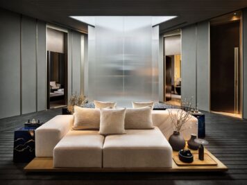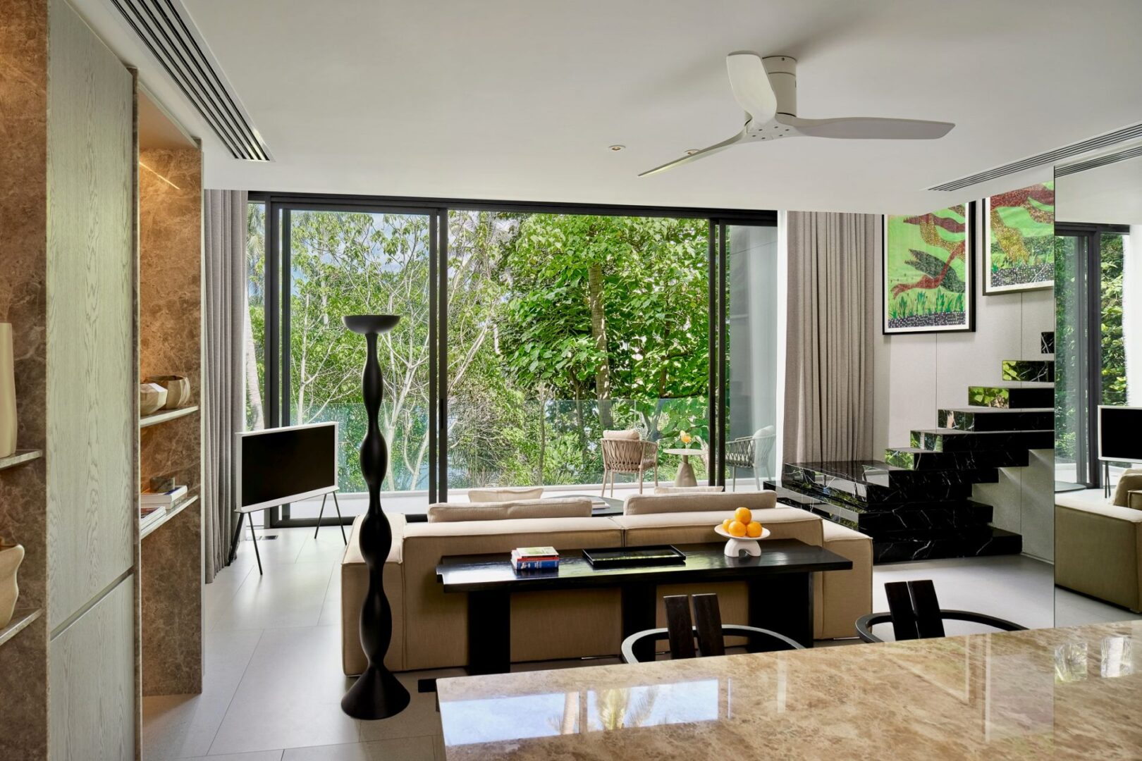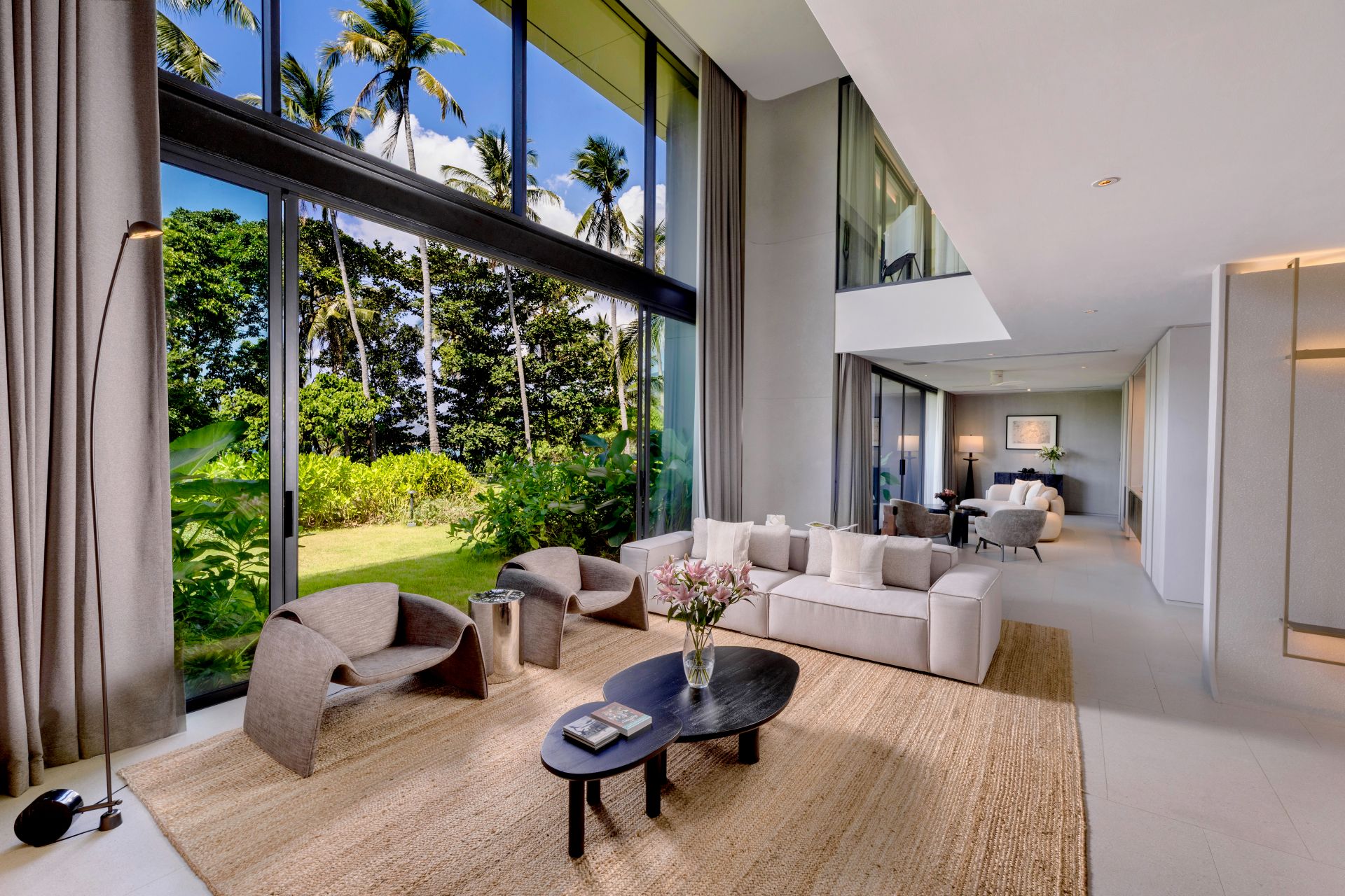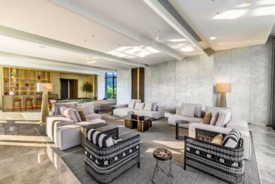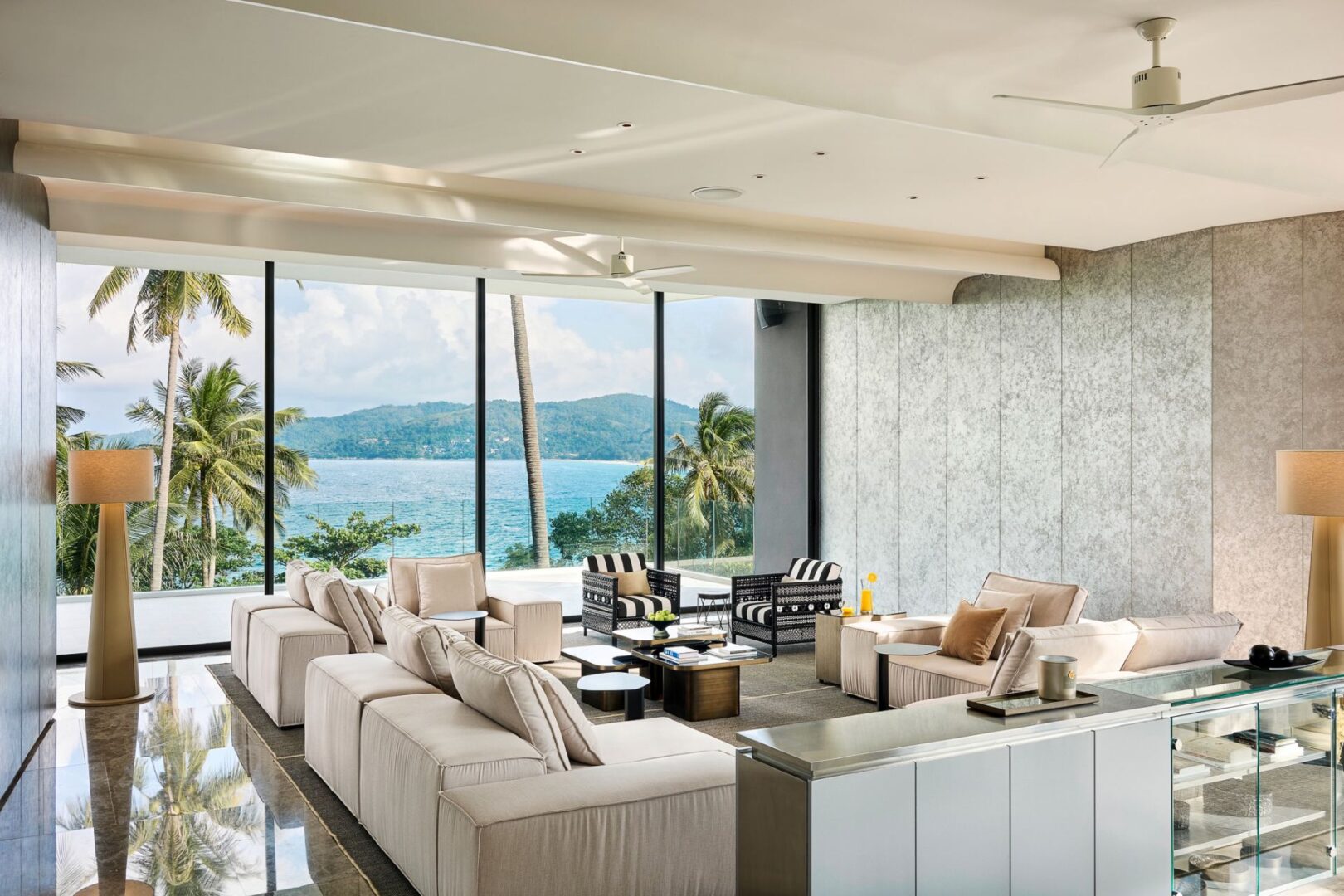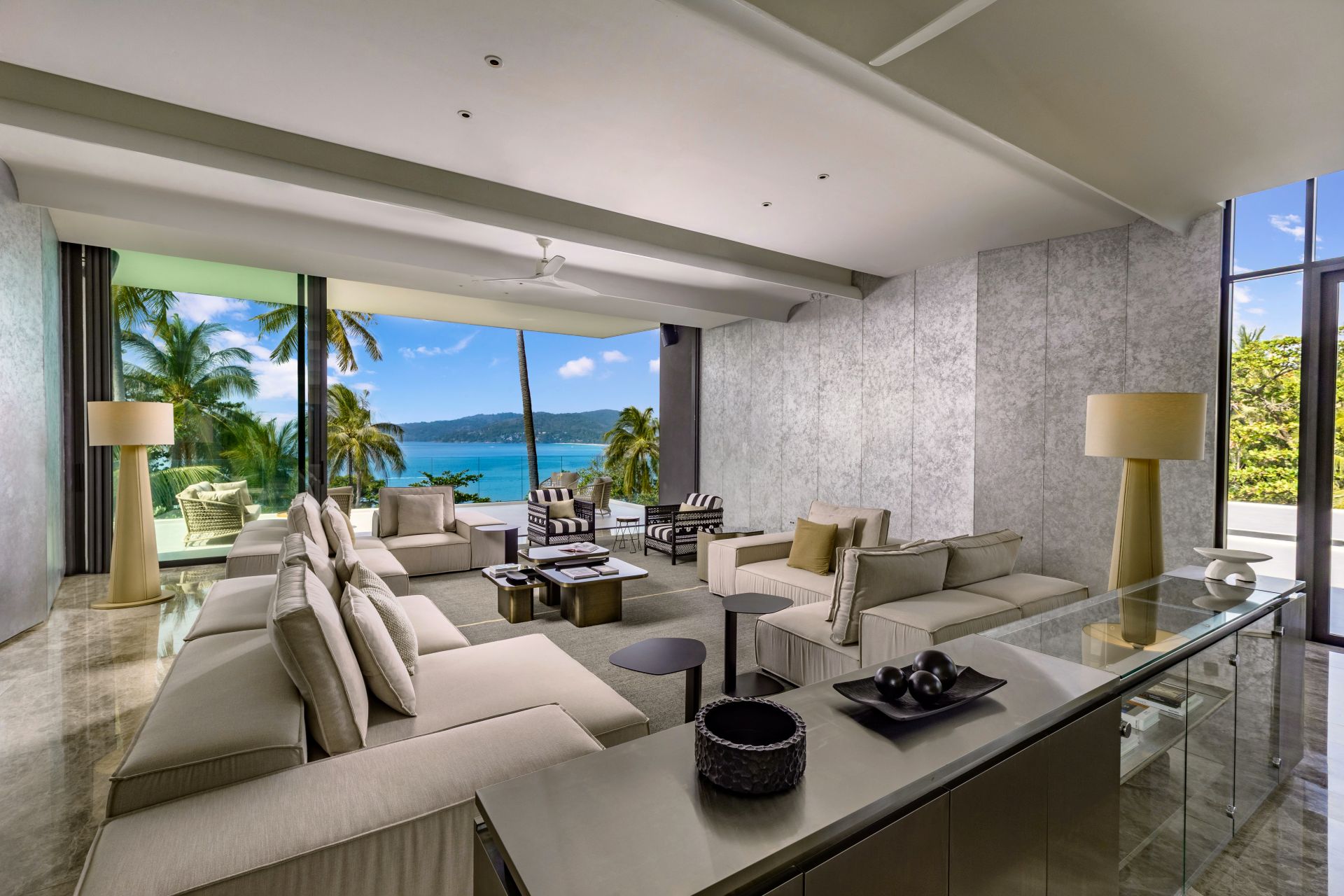 Master Bedroom 1 (151 sqm)— Living Area: Panoramic sea view; 2 lounge seating areas for 12 people; Pantry with sink; 55-inch Smart TV; Telephone; Powder room with Toto Neorest Smart Toilet; Air conditioning; Ceiling fans;