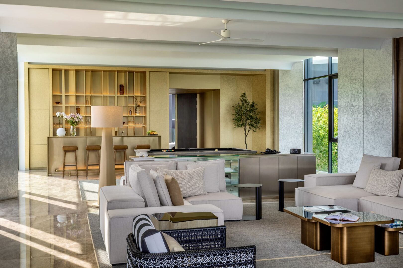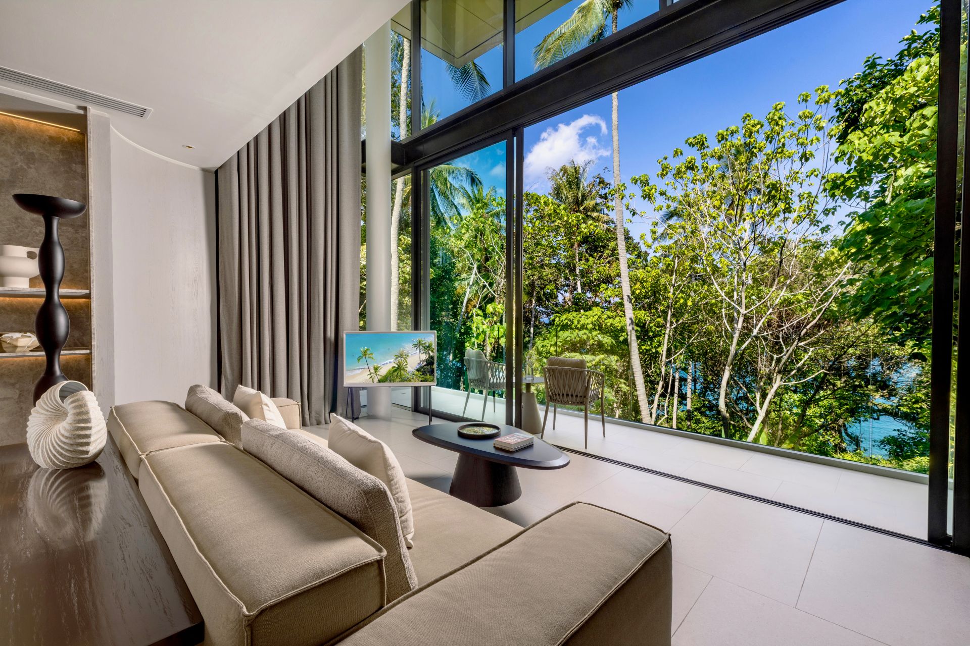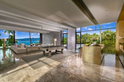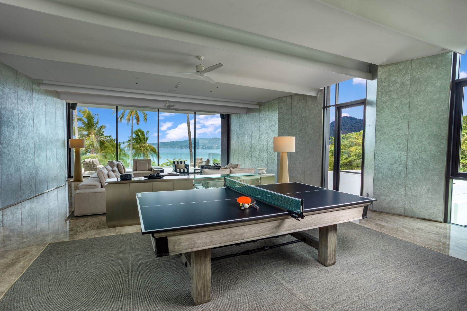 Villa Zai blends privacy with sophistication, offering an opulent sanctuary for guests who enjoy the finer things in life. The expansive living room, with seating for 20 and a stunning backdrop of sea views, includes a billiards table that can be converted for table tennis. A nearby dining room not only includes a terrace for all-day dining but also a private bar and poker table for gaming.
