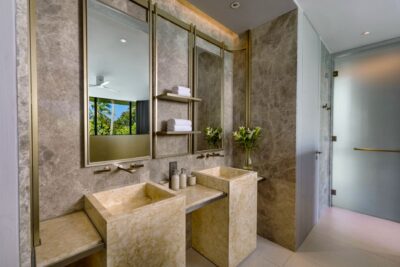 Guest Bedroom 2 (49 sqm)— Panoramic sea view; Emperor-size bed; Balcony with outdoor table and chairs; 43-inch Smart TV; Closet; Safety box; Air conditioning; Ceiling fans; Minibar; Telephone; Working table and chair; Ensuite bathroom with Grohe rain shower, Kohler shower, Powder room with Toto Neorest Smart Toilet, Double vanities; Clothes drying rack; Toiletries; Hairdryer; Bathrobes; Slippers; Beach bag; Laundry bag; Umbrella