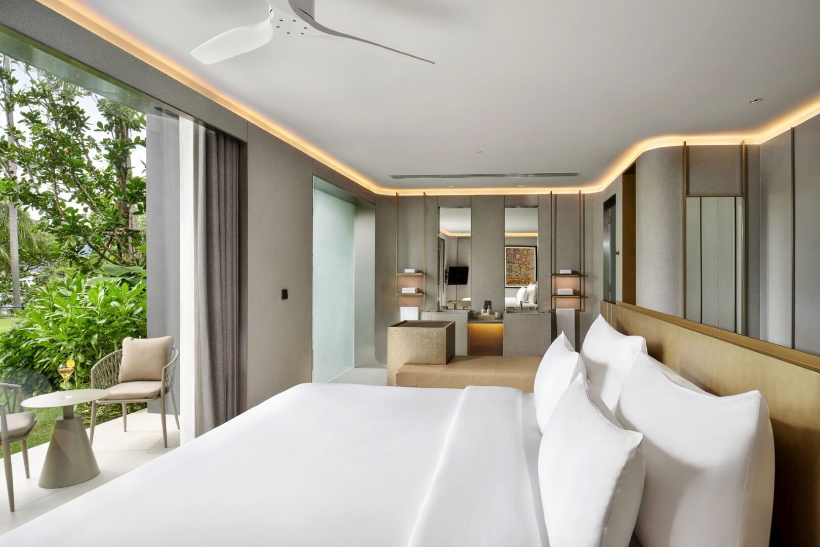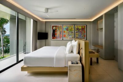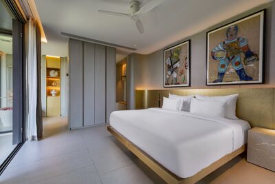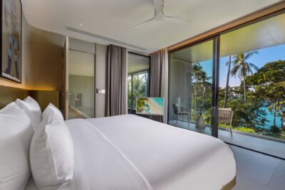 Guest Bedroom 5 (49 sqm) — Panoramic sea view; Emperor-size bed; 43-inch Smart TV; Working table and chair; Balcony with outdoor table and chairs; Ensuite bathroom with Grohe rain shower, Kohler shower, Powder room with Toto Neorest Smart Toilet, Double vanities; Closet; Safety box; Air conditioning; Ceiling fans; Minibar; Telephone; Clothes drying rack; Toiletries; Hairdryer; Bathrobes; Slippers; Beach bag; Laundry bag; Umbrella