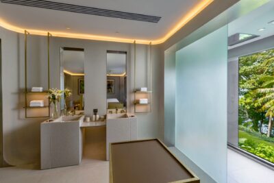 Guest Bedroom 1 (49 sqm) — Panoramic sea view; 2 single-size beds or Emperor size bed; Balcony with outdoor table and chairs; 43-inch Smart TV; Closet; Safety box; Air conditioning; Ceiling fan; Minibar; Telephone; Working table and chair; Ensuite bathroom with Grohe rain shower, Kohler shower, Powder room with Toto Neorest Smart Toilet, Double vanities; Clothes drying rack; Toiletries; Hairdryer; Bathrobes; Slippers; Beach bag; Laundry bag; Umbrella