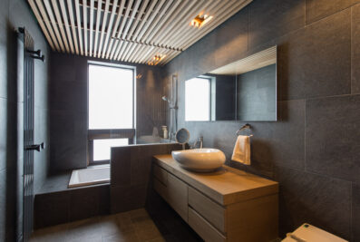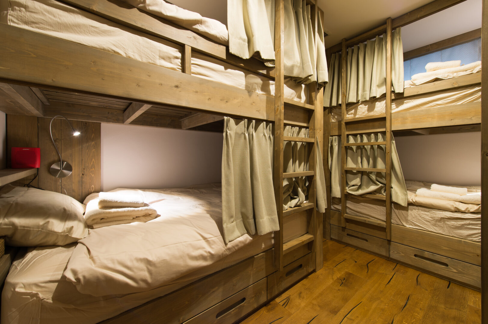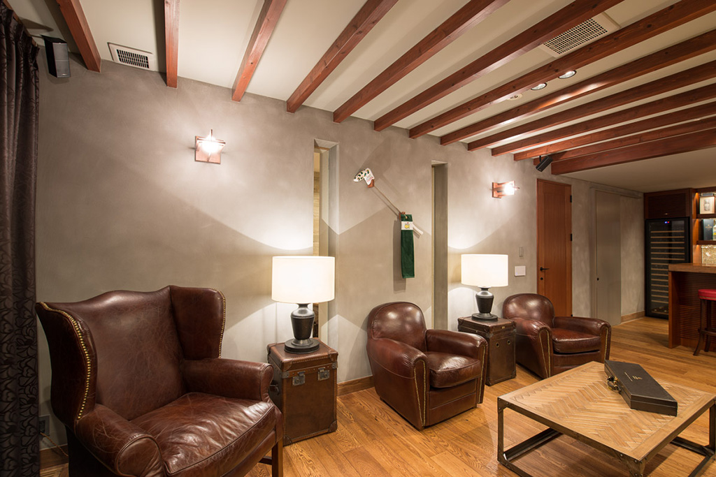 A so-called ‘man cave’ or den has leather armchairs and a flat-screen TV with its bar. Sliding doors lead out to a covered patio with a funky ski-lift suspended seat and a brazier to keep warm and cozy in the evenings. In the games room, guests can enjoy gaming with the XBOX One or have a championship Bonzini foosball match.