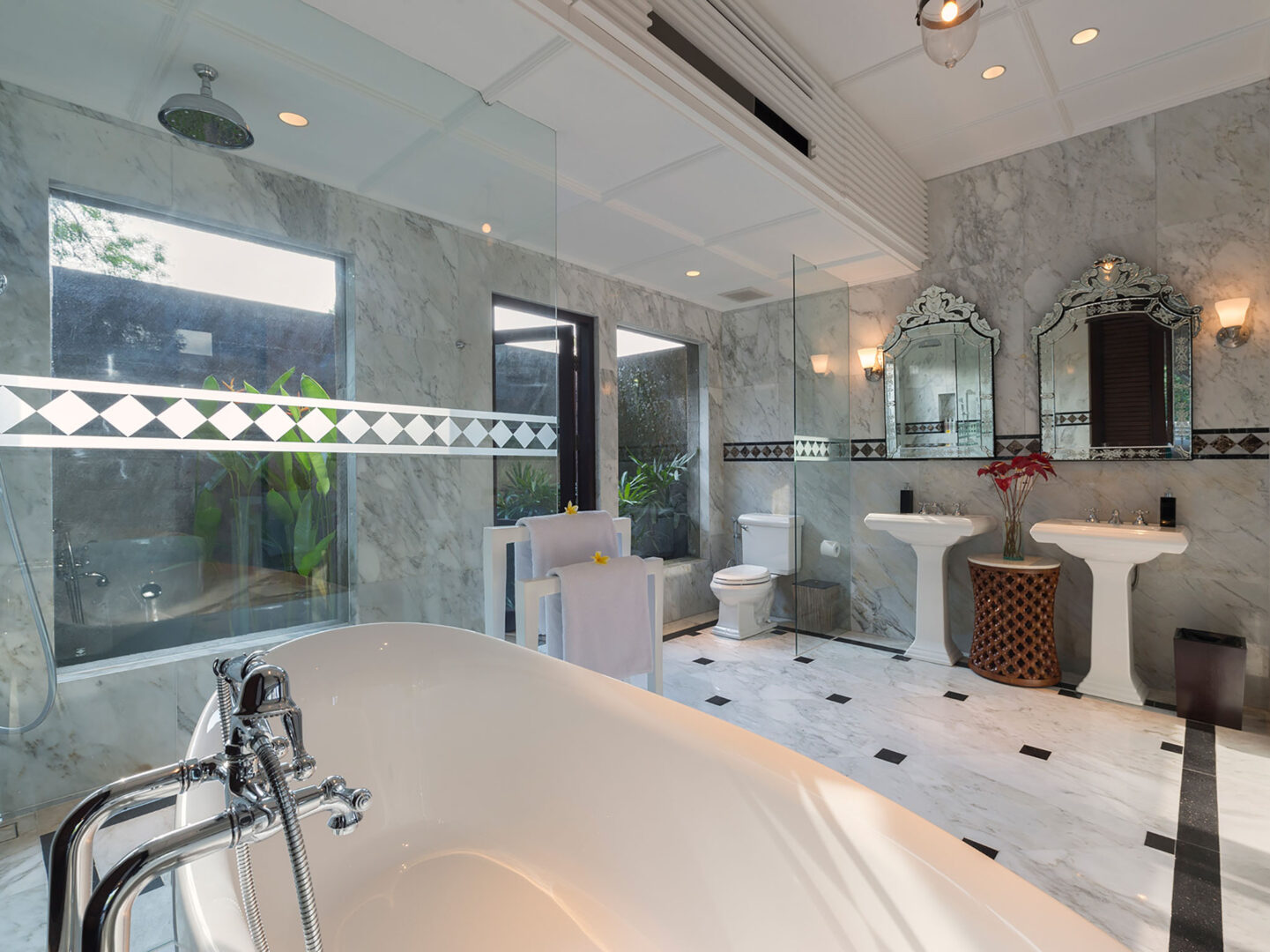Pilisan Daja (Guest Bedroom 6) — Pool & garden views; King size bed; Plunge pool (Length 5m, width 3m, depth 1.1m); Shared covered terrace with seating for 5 persons; 40-inch flat screen TV with Transvisions cable; DVD player; SONY sound system; Intercom; Walk-in closet; Safety Box; Makeup table; Air conditioning; Ceiling fan; Ensuite bathroom with bathtub & shower, rain shower & shower, outdoor shower, double vanities, and toilet; Toiletries; Hairdryer; Slippers; Bathrobes; Umbrellas