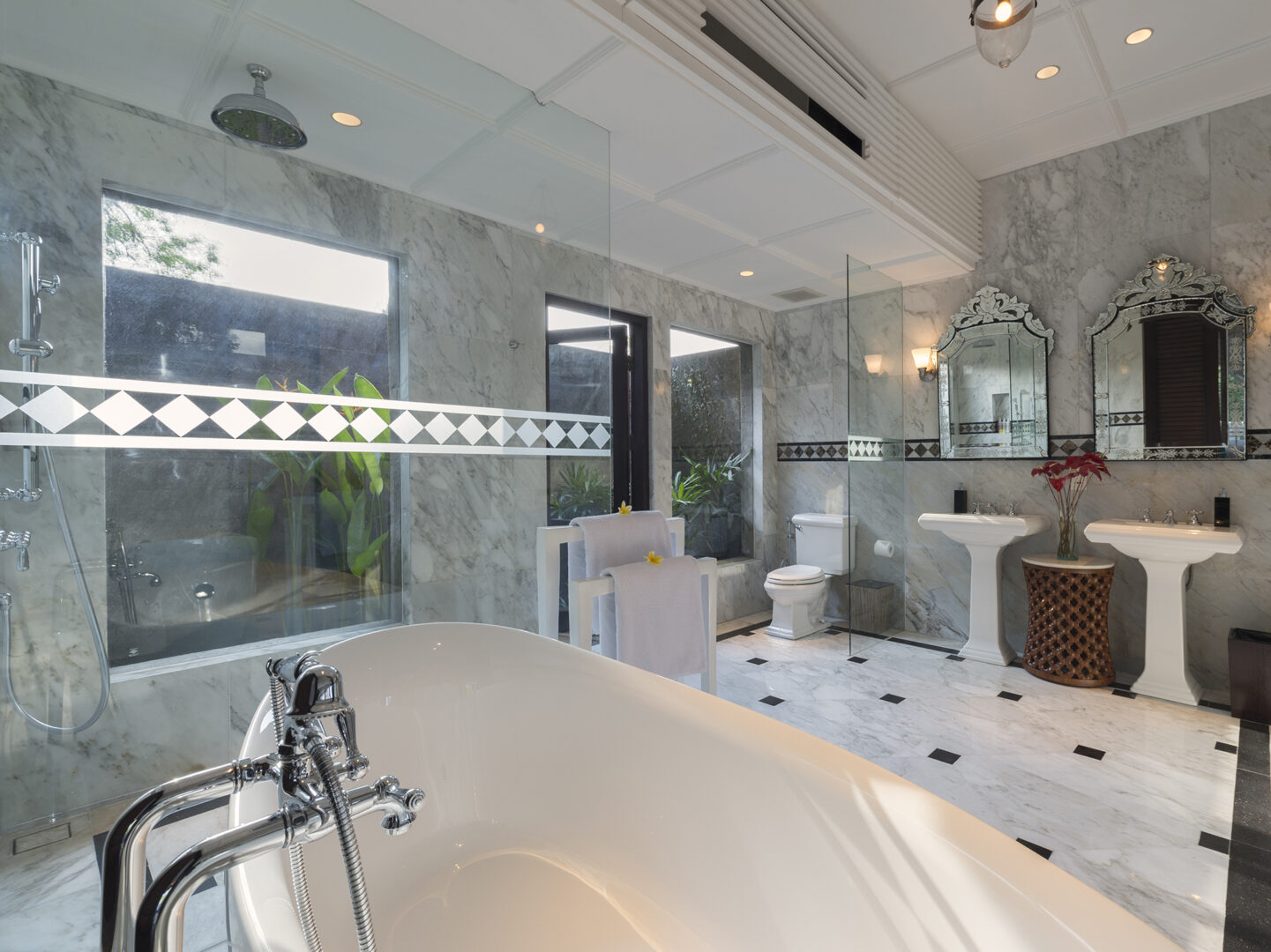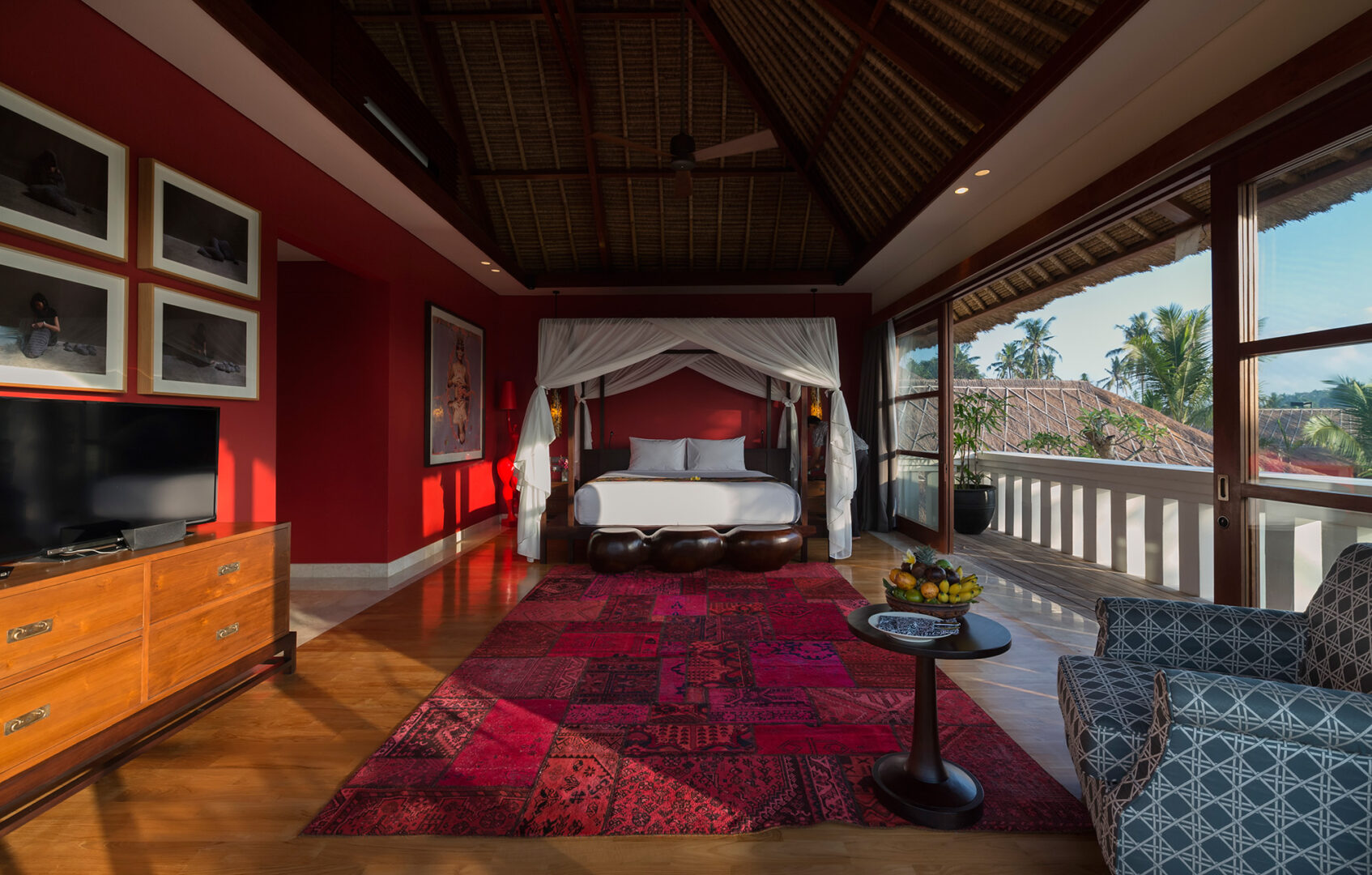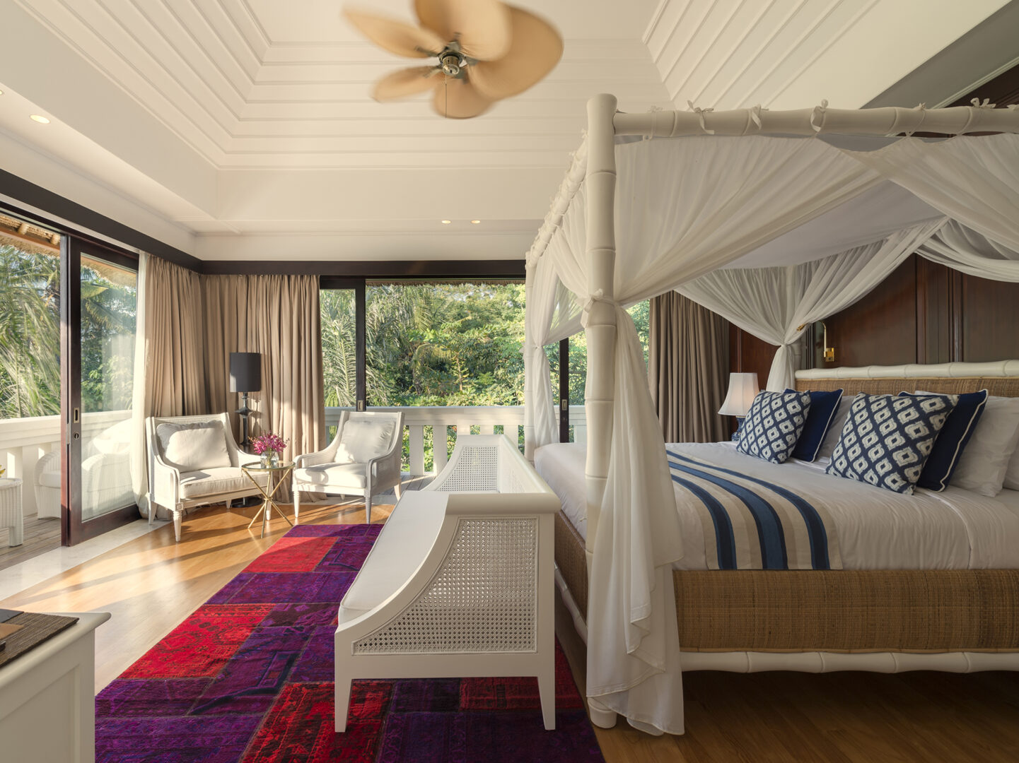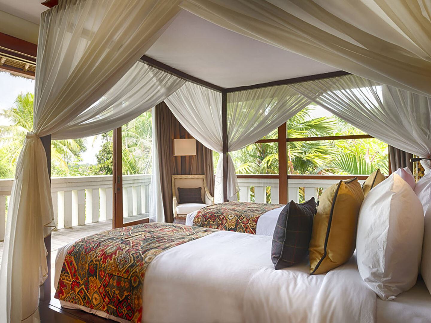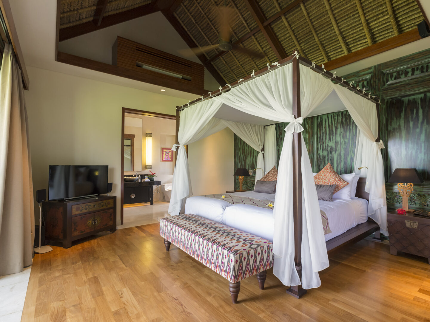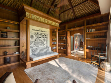 Set in royal lands, Villa Kaba Kaba exudes a regal quality with its four-poster beds and ornate features. While the master suite boasts its sundeck plunge pool, every part of the villa exudes relaxation, privacy, and luxurious splendor. En-suite rooms have balconies and fan out from a central courtyard, while a long infinity pool stretches a glorious 25 meters out into the green villa garden flanked by wonderful white daybeds for two.