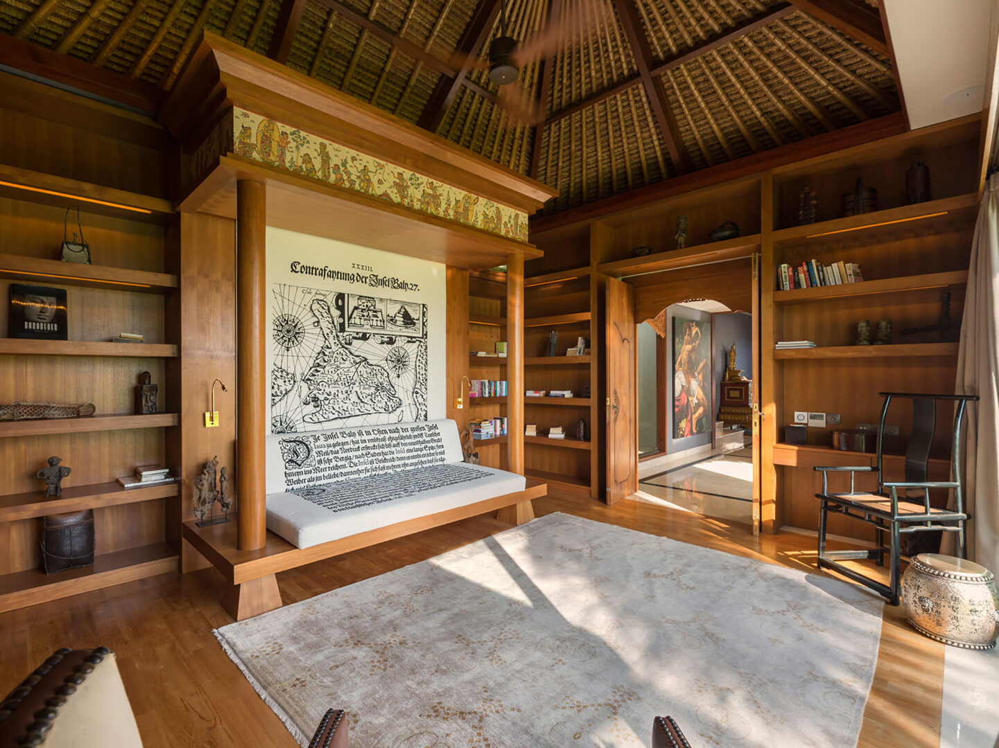 The extravagant dining area, with its solid suarwood table and fine-dining dinners prepared by private chefs in the fully equipped kitchen, looks out to gardens through big sliding doors. The main living room is the ultimate design for enjoying pure tropical living. With two separate lounges, Villa Kaba Kaba creates private spaces to relax and contemplate life, the universe, and the luxury of a Balinese villa stay.