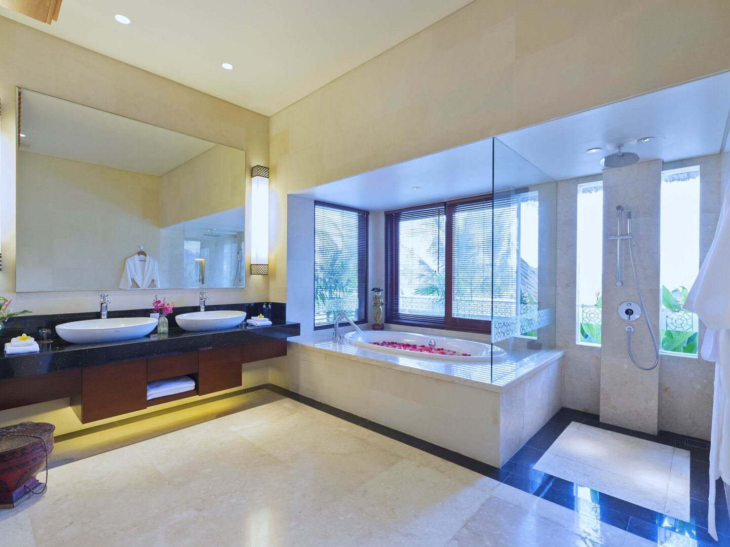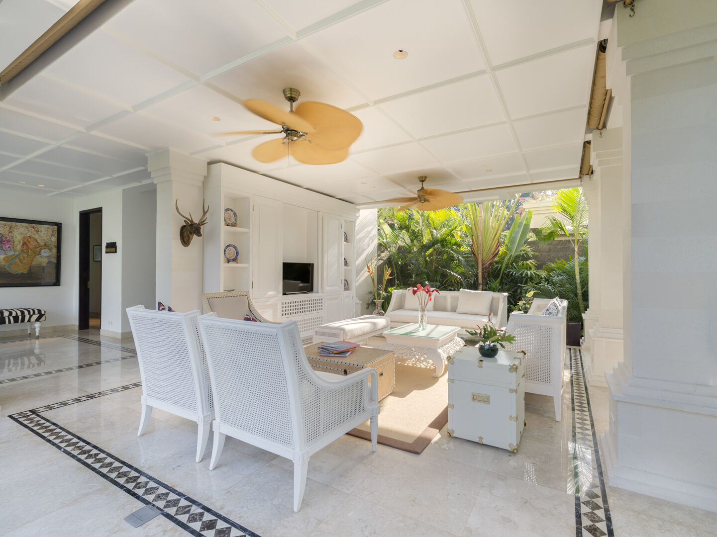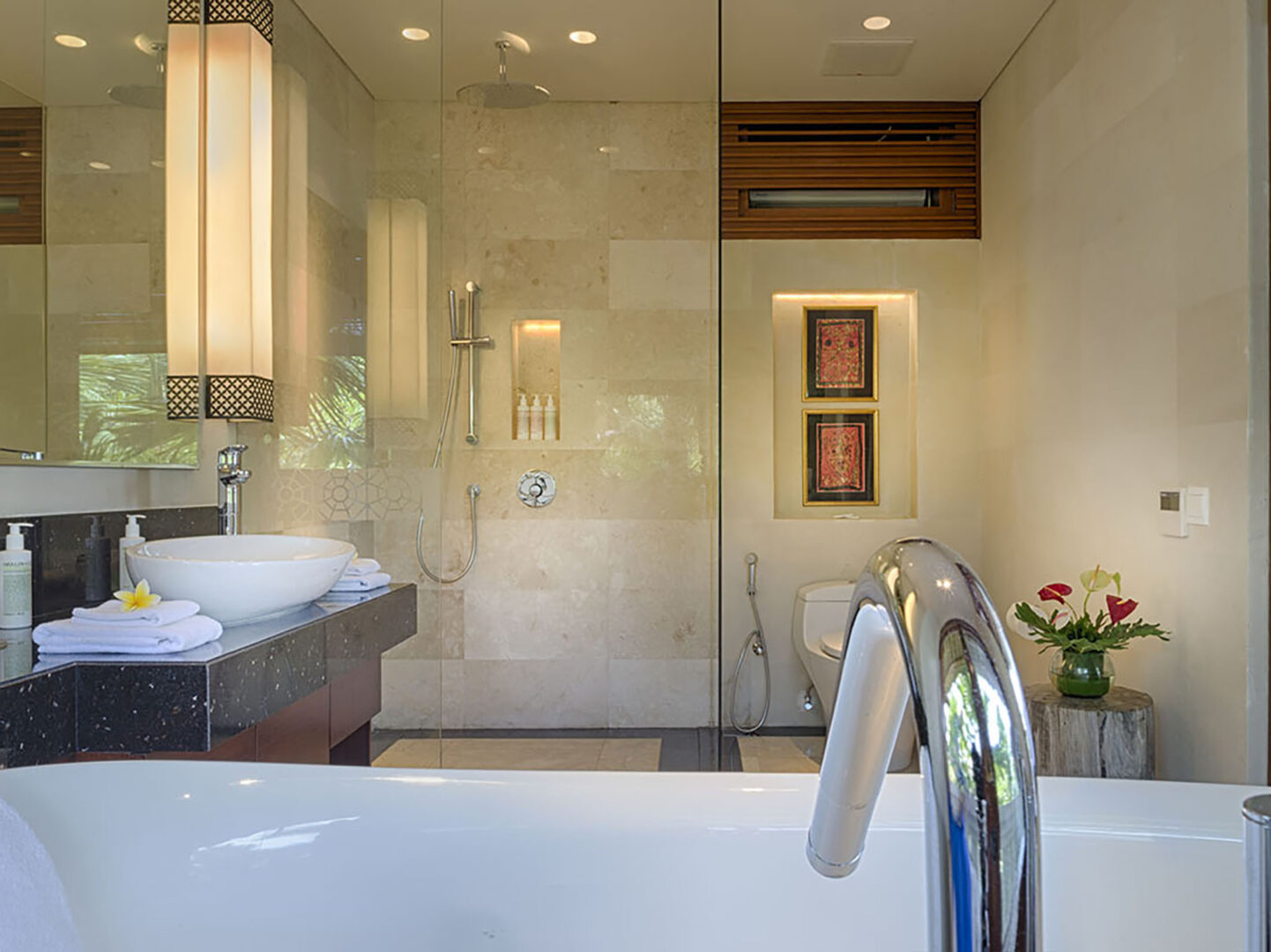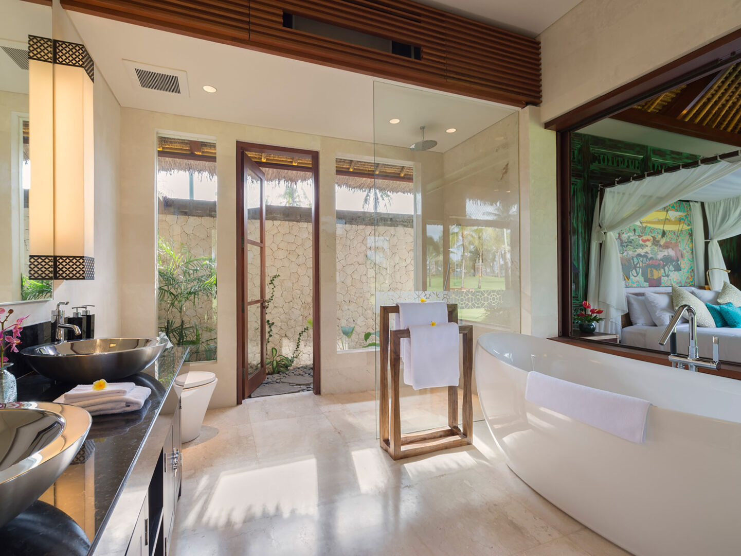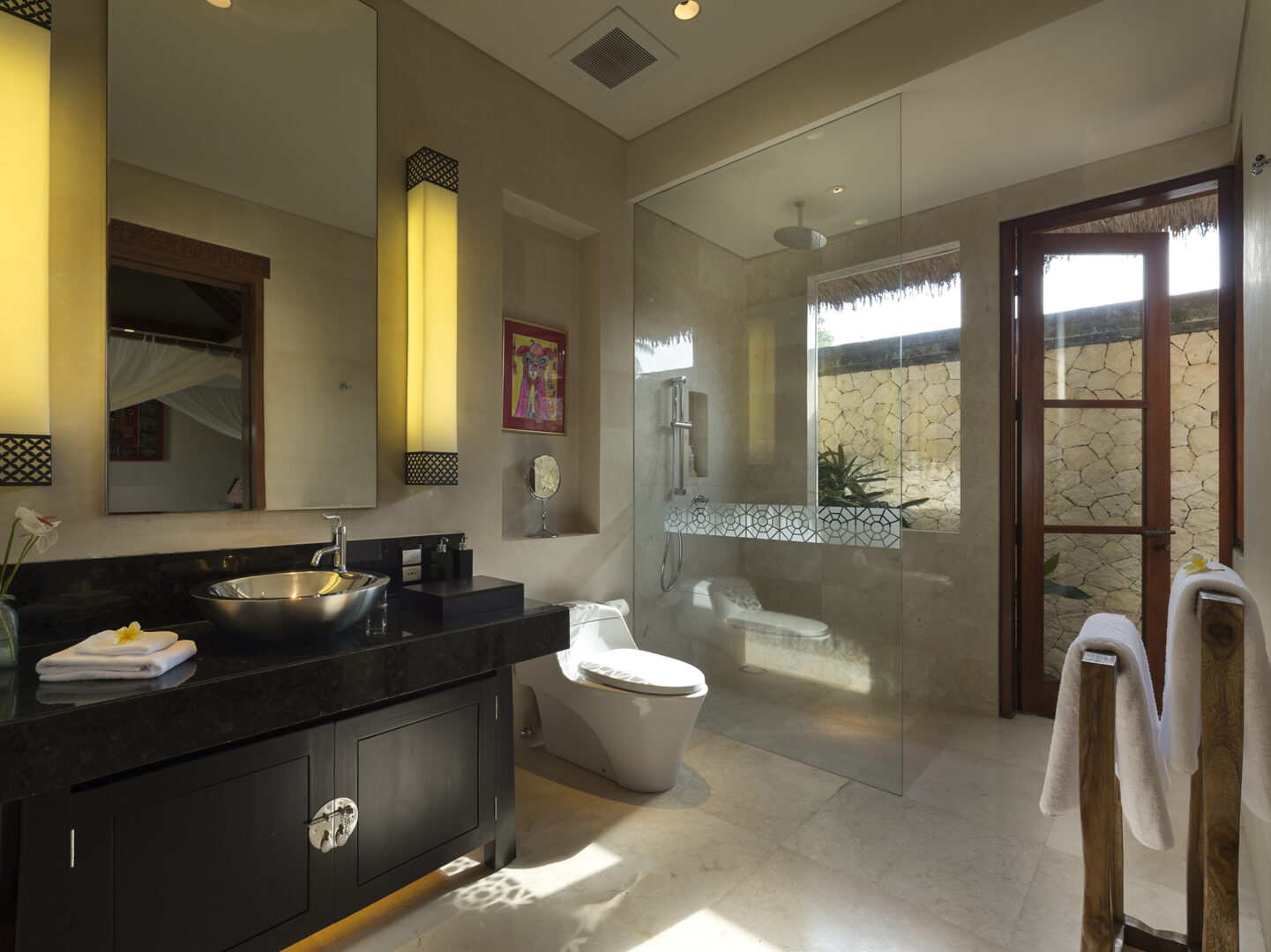 Pande Beten (Guest Bedroom 3) — Garden view; King size bed; Terrace with seating for 4 persons; Seating for 2 persons; 40-inch flat; screen TV with Transvisions cable DVD player; SONY sound system; Intercom; Walk-in closet; Safety box; Makeup table; Air conditioning; Ceiling fan; Ensuite bathroom with Bathtub & shower, Rain shower & shower, Outdoor shower & shower, Double vanities, and Toilet; Toiletries; Hairdryer; Slippers; Bathrobes; Umbrellas