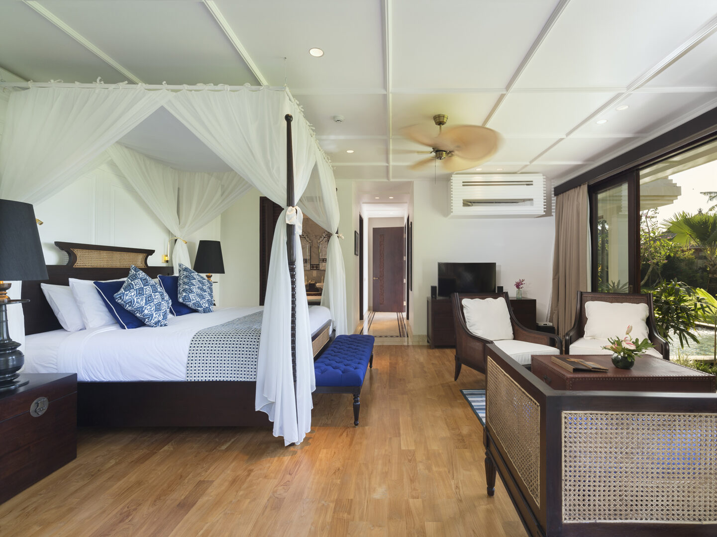 Juntal Daja (Guest Bedroom 1) — Pool & garden views; King size bed; Seating area for 2 persons; Balcony with 2 seating; 40-inch flat screen TV with Transvisions cable; DVD player; SONY sound system; Intercom; Walk-in closet; Safety box; Makeup table; Air conditioning; Ceiling fan; Ensuite bathroom with Bathtub & shower, Rain shower & shower, Double vanities, and Toilet; Toiletries; Hairdryer; Slippers; Bathrobes; Umbrellas