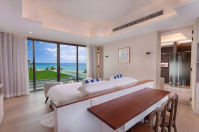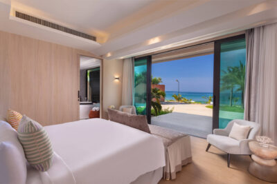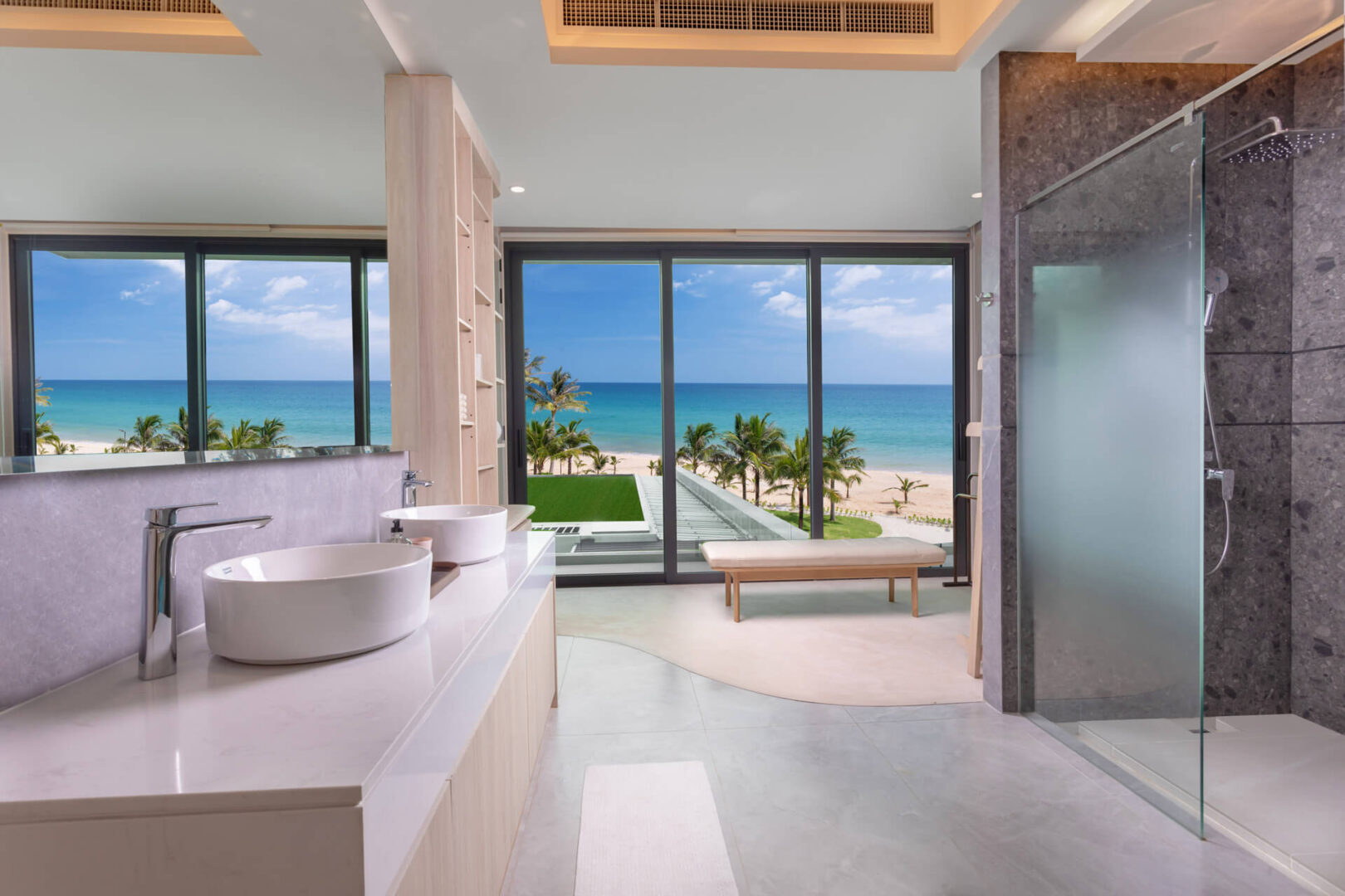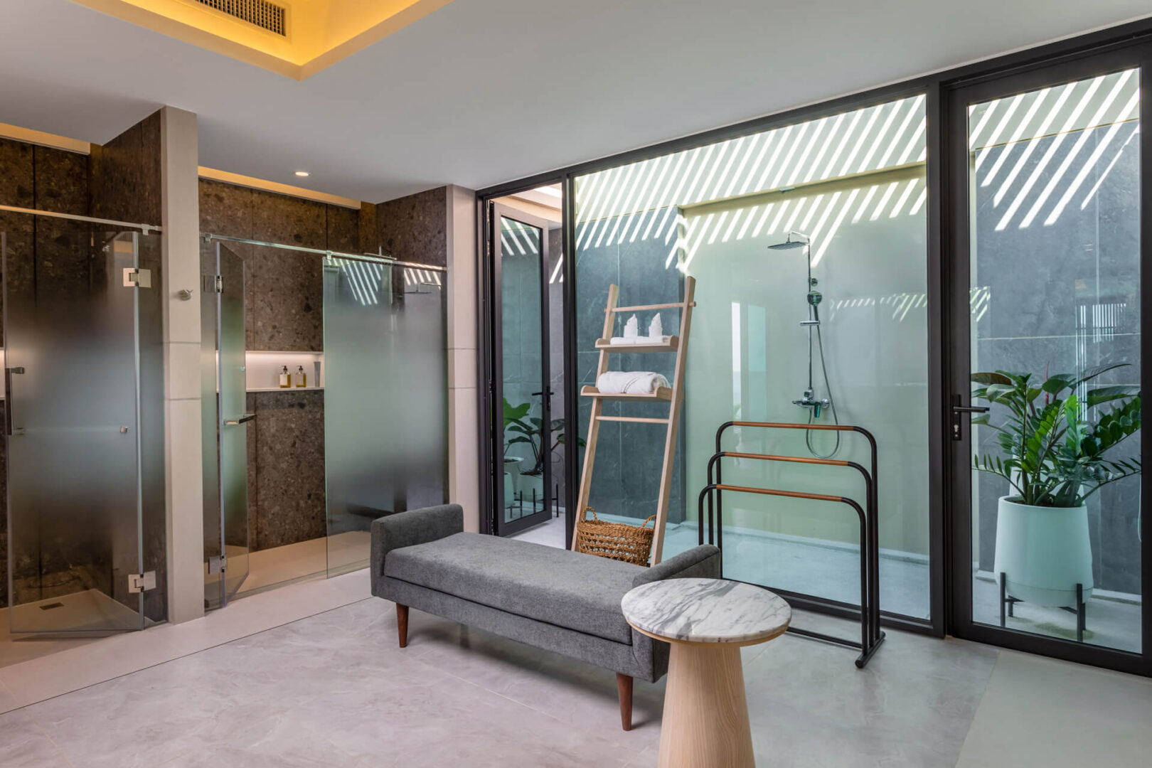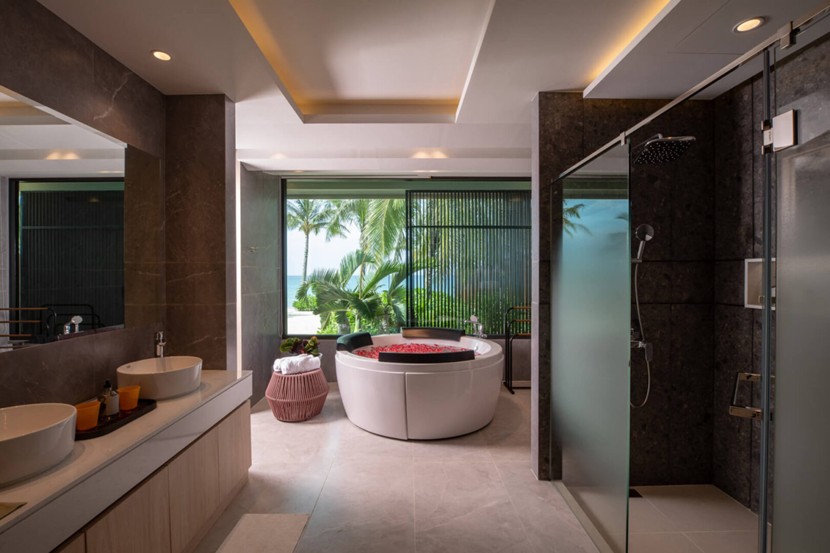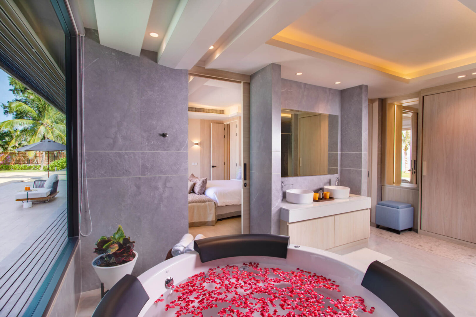 King-size Bed; Bedside Bench (Can be converted into a massage bed); 2 seatings; Reading lights on each side of the bed; Air conditioning; Safety box; Ensuite with Bath & shower, Rain shower & shower, Outdoor shower; double vanities, and separate toilet with bidet; Makeup table; Toiletries; Hair dryer; Bathrobes; Slippers; Beach bag; Beach/outdoor slippers; Yoga mat; Umbrellas.