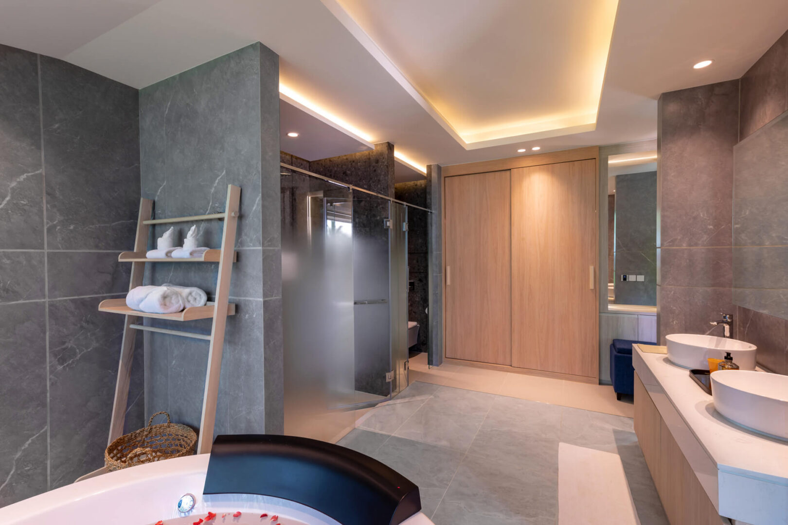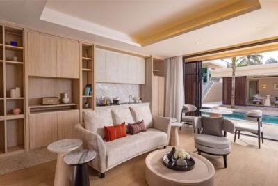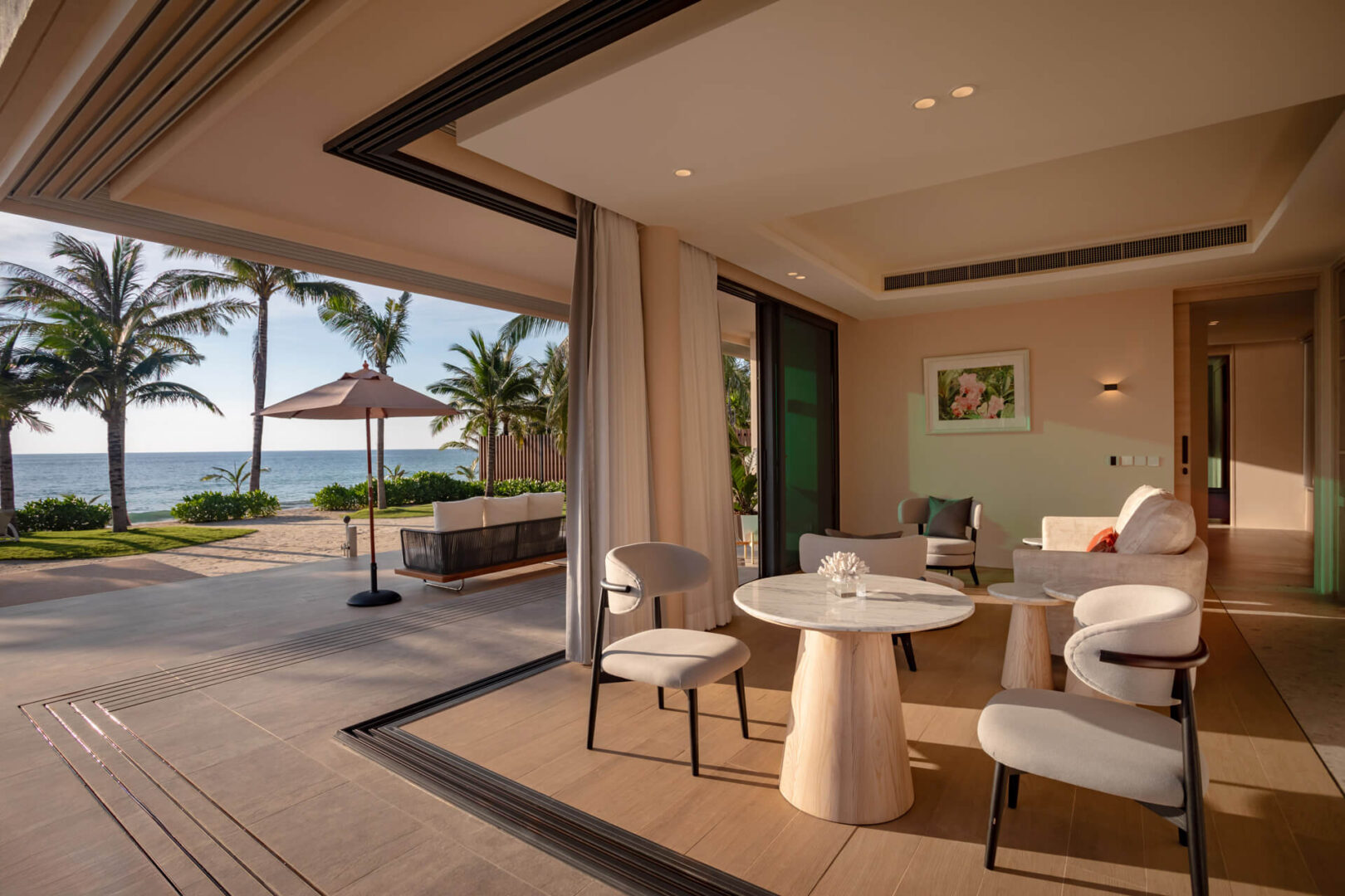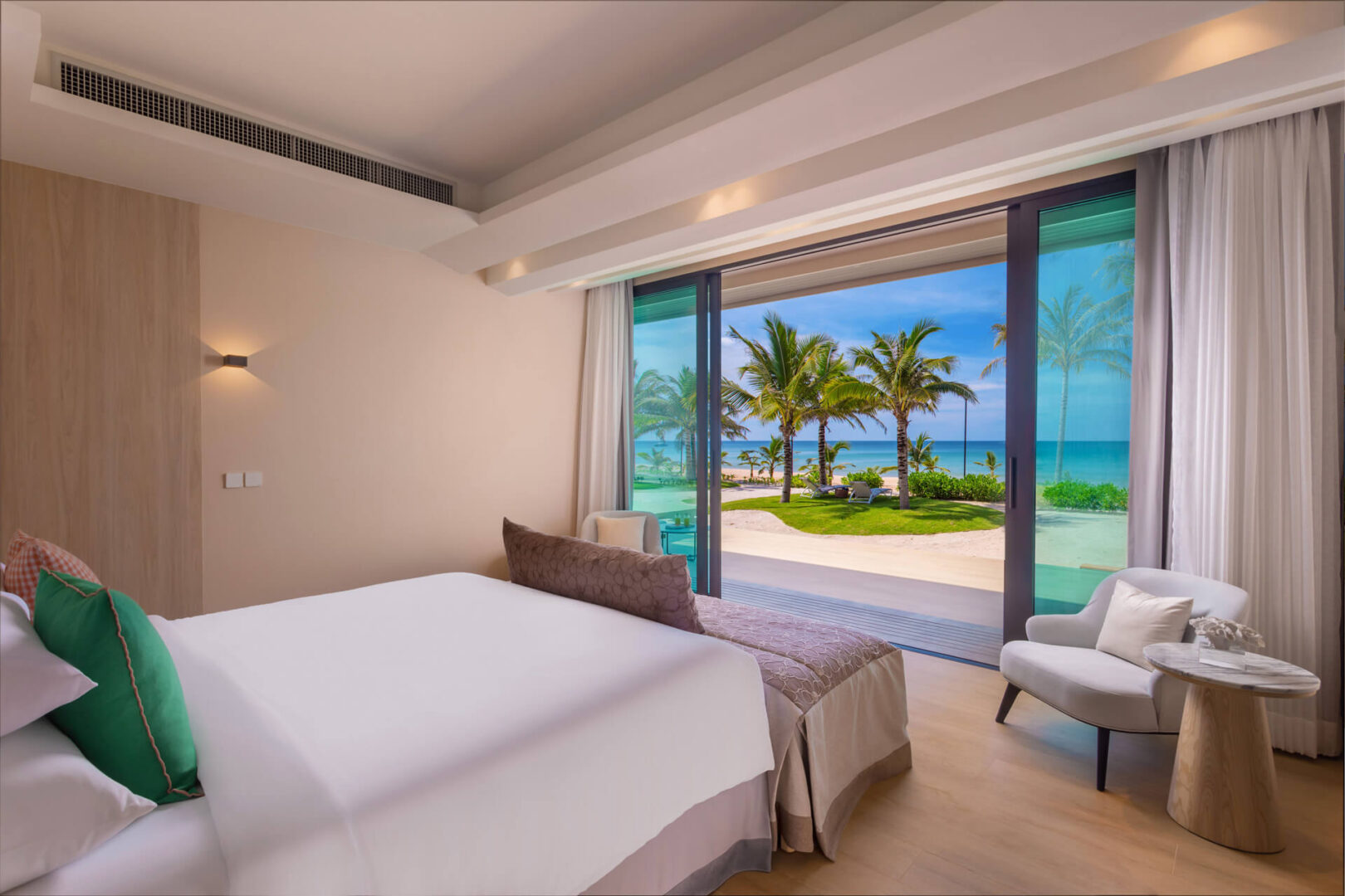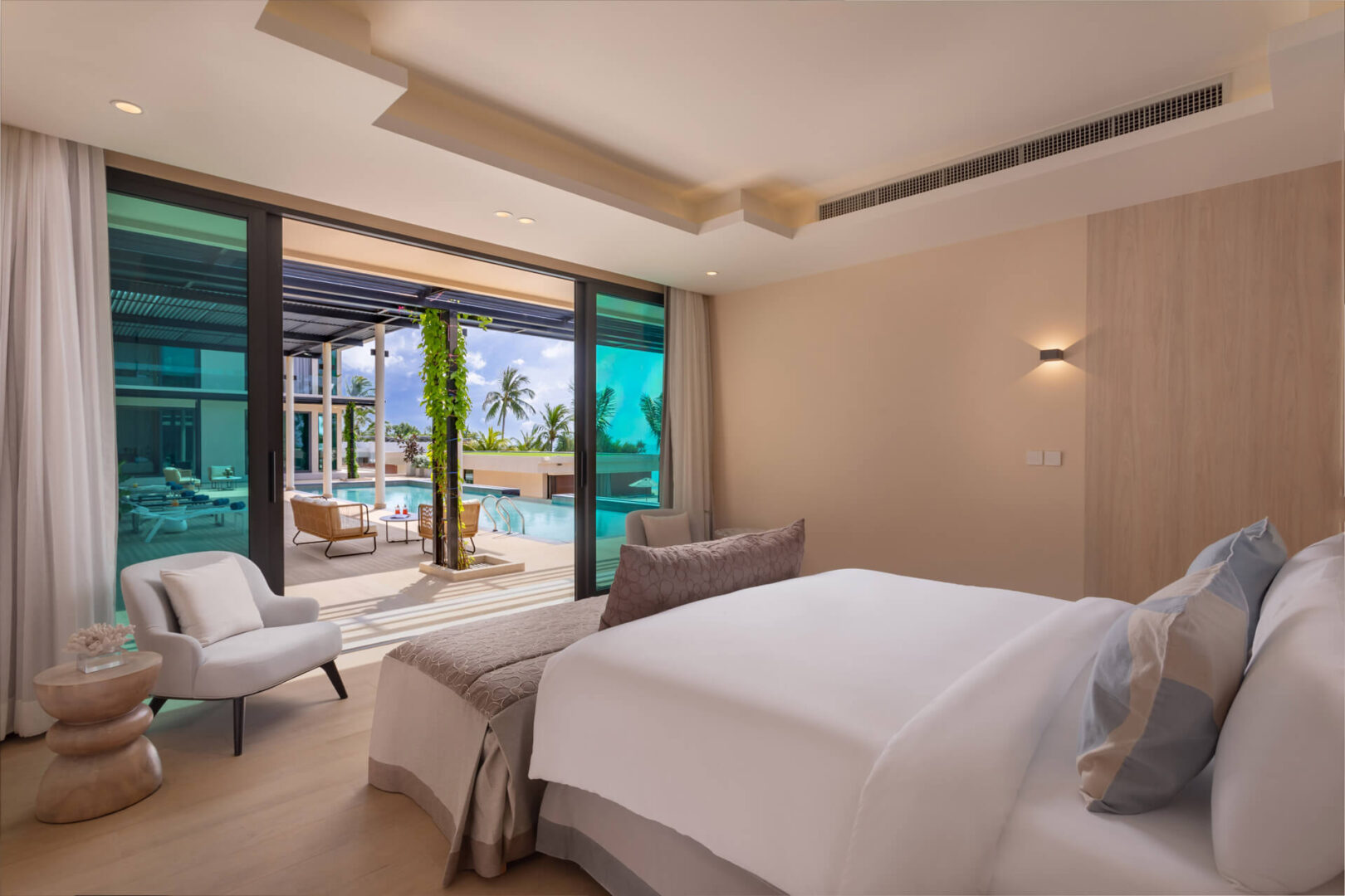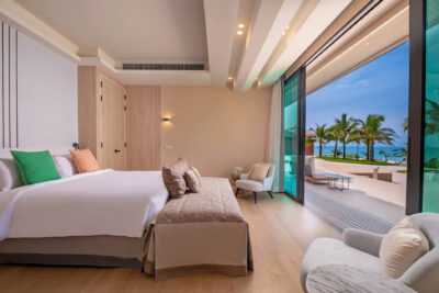 King-size Bed; Bedside Bench (Can be converted into a massage bed); 2 seatings; Reading lights on each side of the bed; Air conditioning; Safety box; Ensuite with Bath & shower, Rain shower & shower, Outdoor shower; double vanities, and separate toilet with bidet; Makeup table; Toiletries; Hair dryer; Bathrobes; Slippers; Beach bag; Beach/outdoor slippers; Yoga mat; Umbrellas.