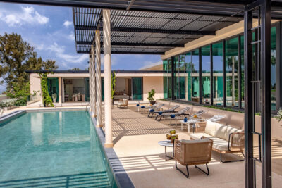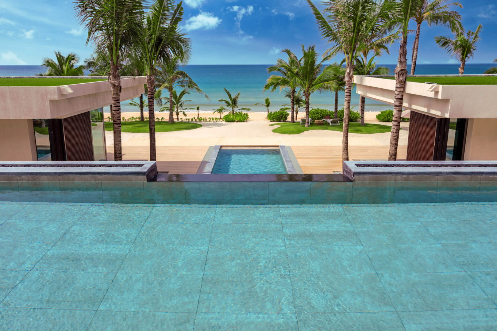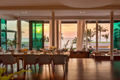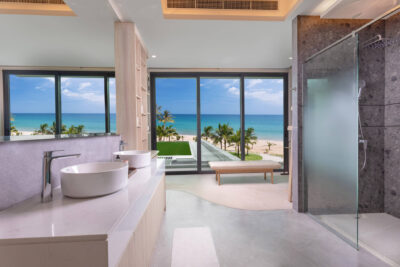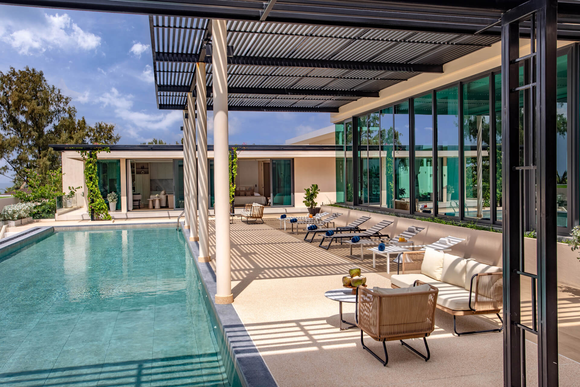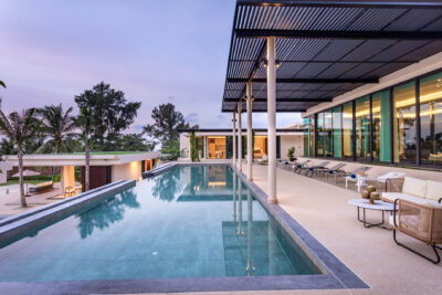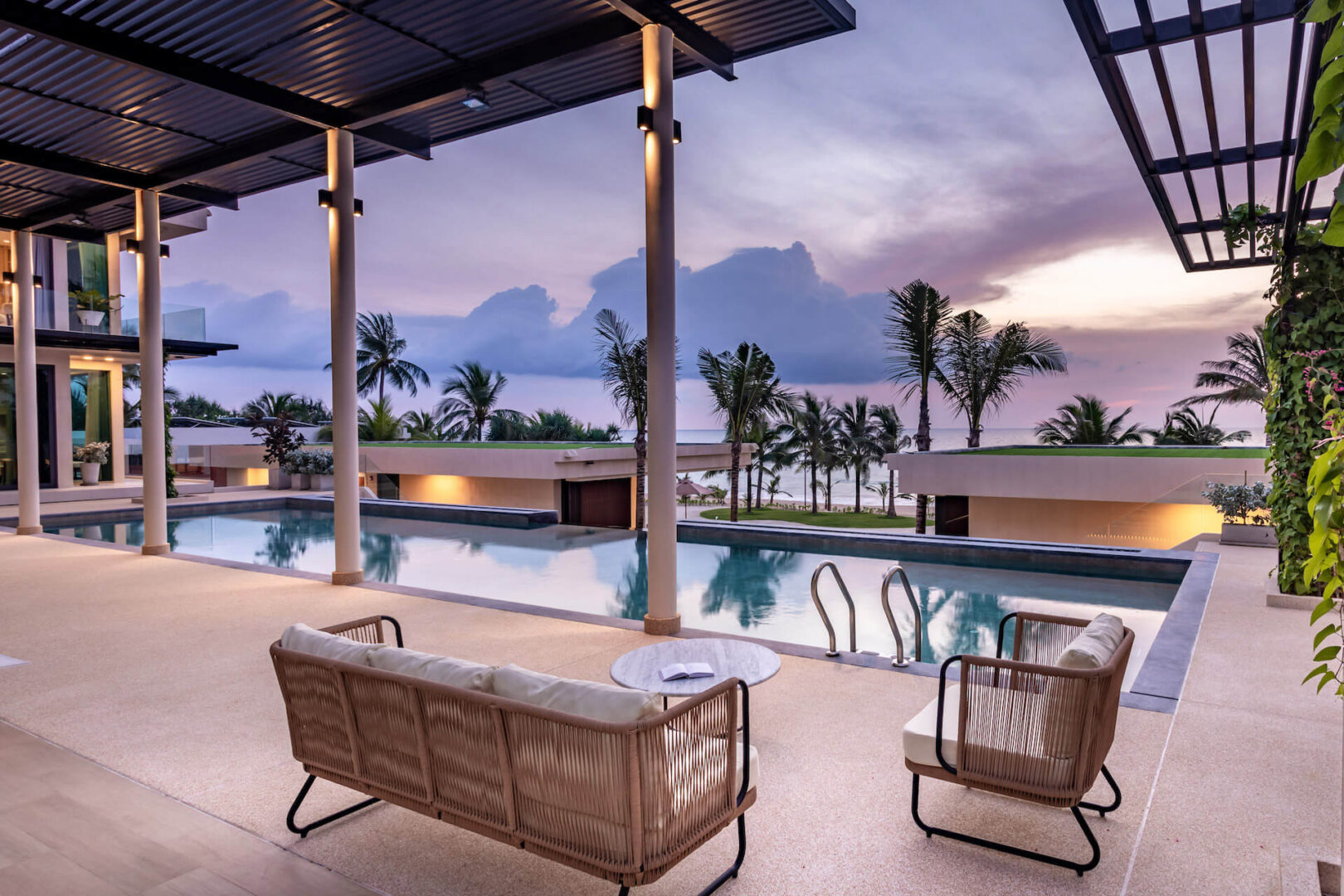 Discover pure luxury and tranquility at this stunning 6-bedroom villa built across the shores of Natai Beach, Phuket’s hidden gem. Stretching along the 4,000 square meters of land, the beachfront retreat blends modern design with nature’s beauty. The two infinity swimming pools effortlessly provide breathtaking ocean views in the 2,950-square-meter villa, offering a harbor of comfort. Its pool area provides plenty of seating around the pool for guests to soak in the tropical splendor.