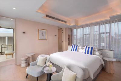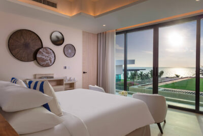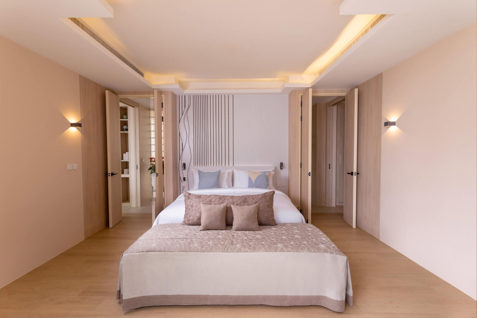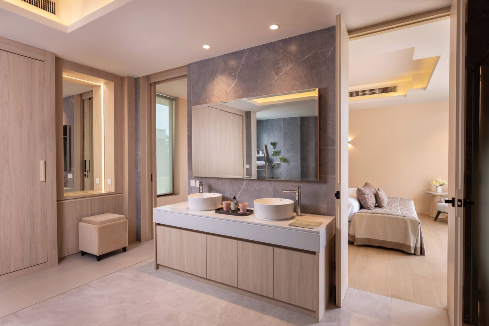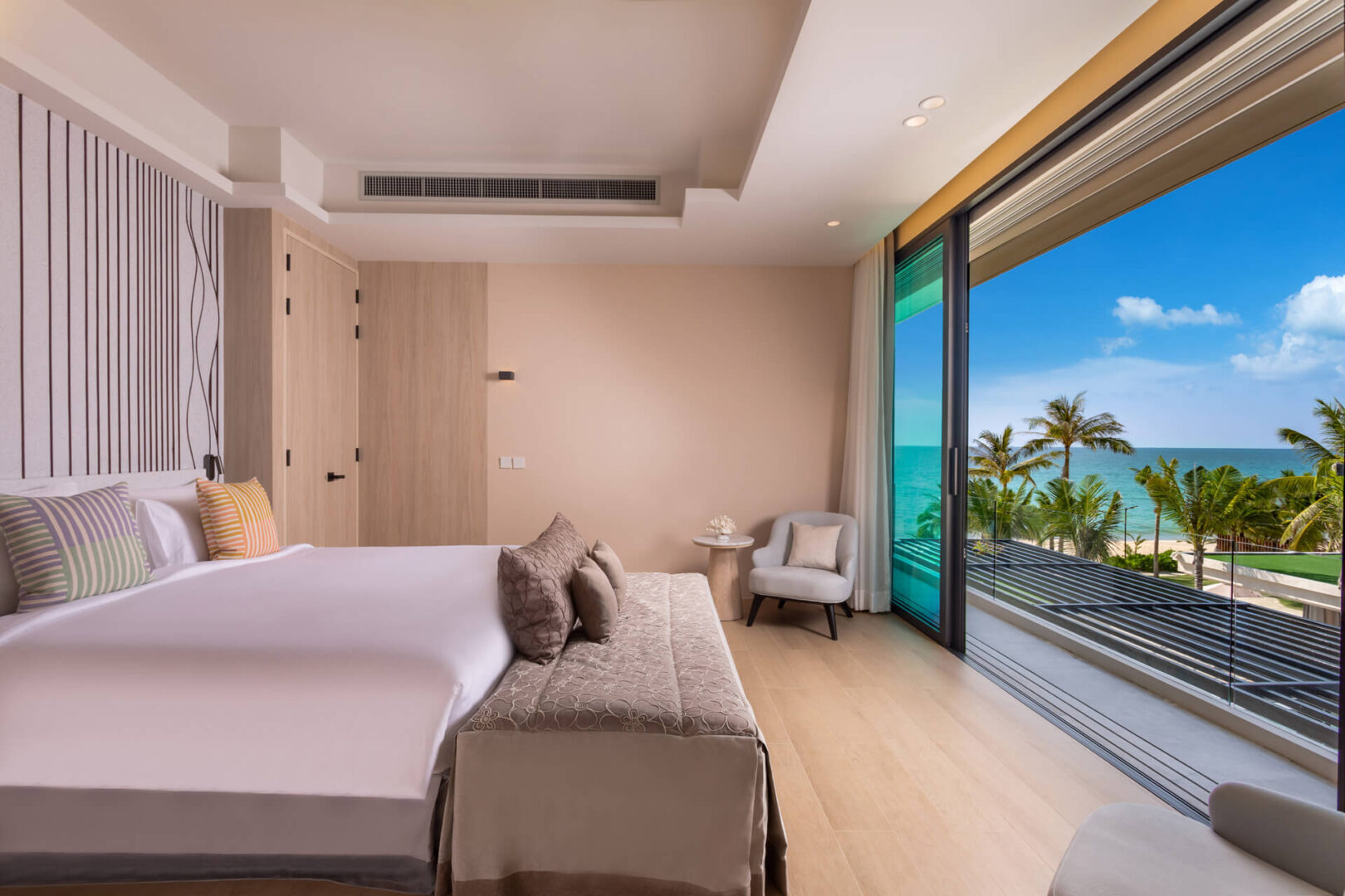 King-size Bed; Bedside Bench (Can be converted into a massage bed); 2 seatings; Reading lights on each side of the bed; Air conditioning; Safety box; Ensuite with Bath & shower, Rain shower & shower, double vanities, and separate toilet with bidet; Makeup table; Toiletries; Hair dryer; Bathrobes; Slippers; Beach bag; Beach/outdoor slippers; Yoga mat; Umbrellas.