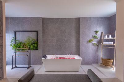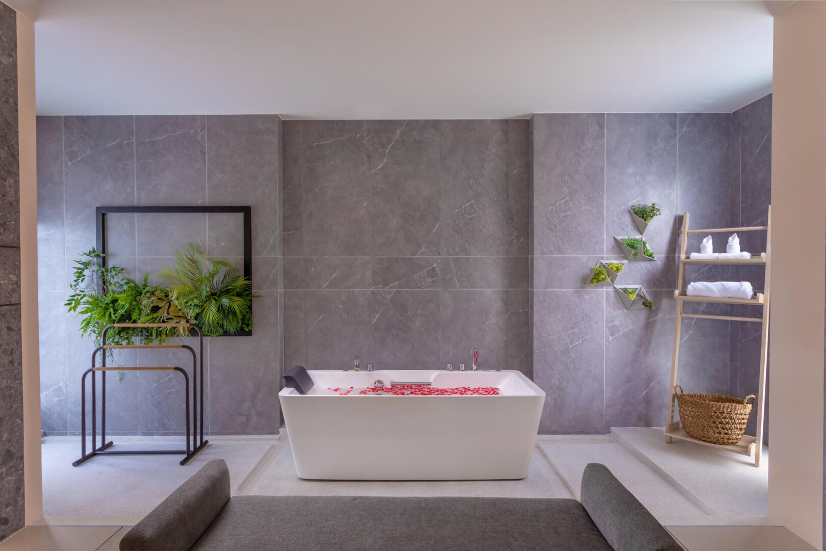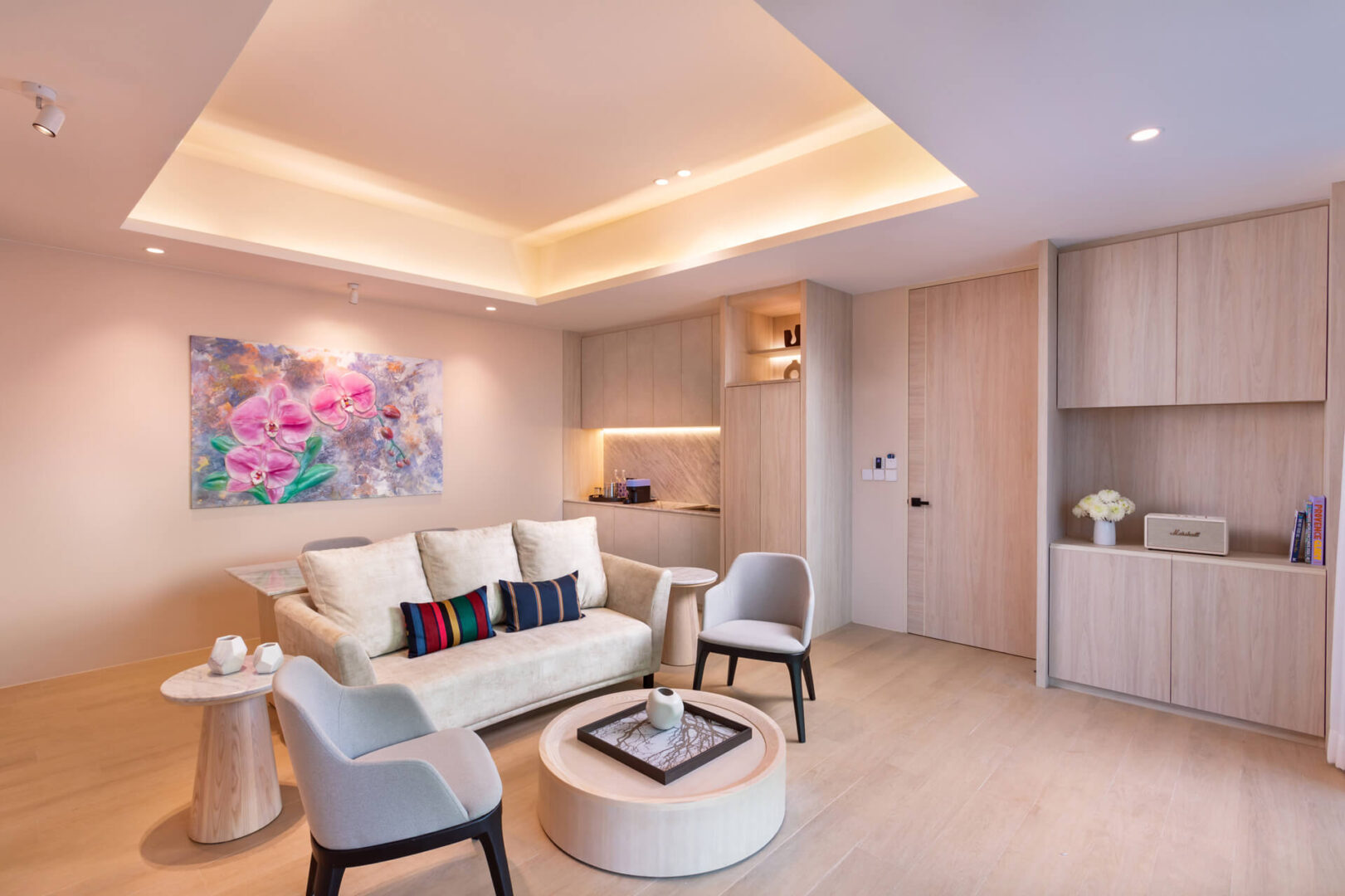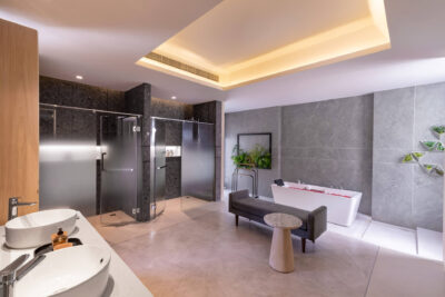 King-size Bed; Bedside Bench (Can be converted into a massage bed); 2 seatings; Reading lights on each side of the bed; Air conditioning; Counter with sink; Safety box; Ensuite with Jacuzzi Bath & shower, Rain shower & shower, double vanities, and separate toilet with bidet; Makeup table; Toiletries; Hair dryer; Bathrobes; Slippers; Beach/outdoor slippers; Yoga mat; Umbrellas.