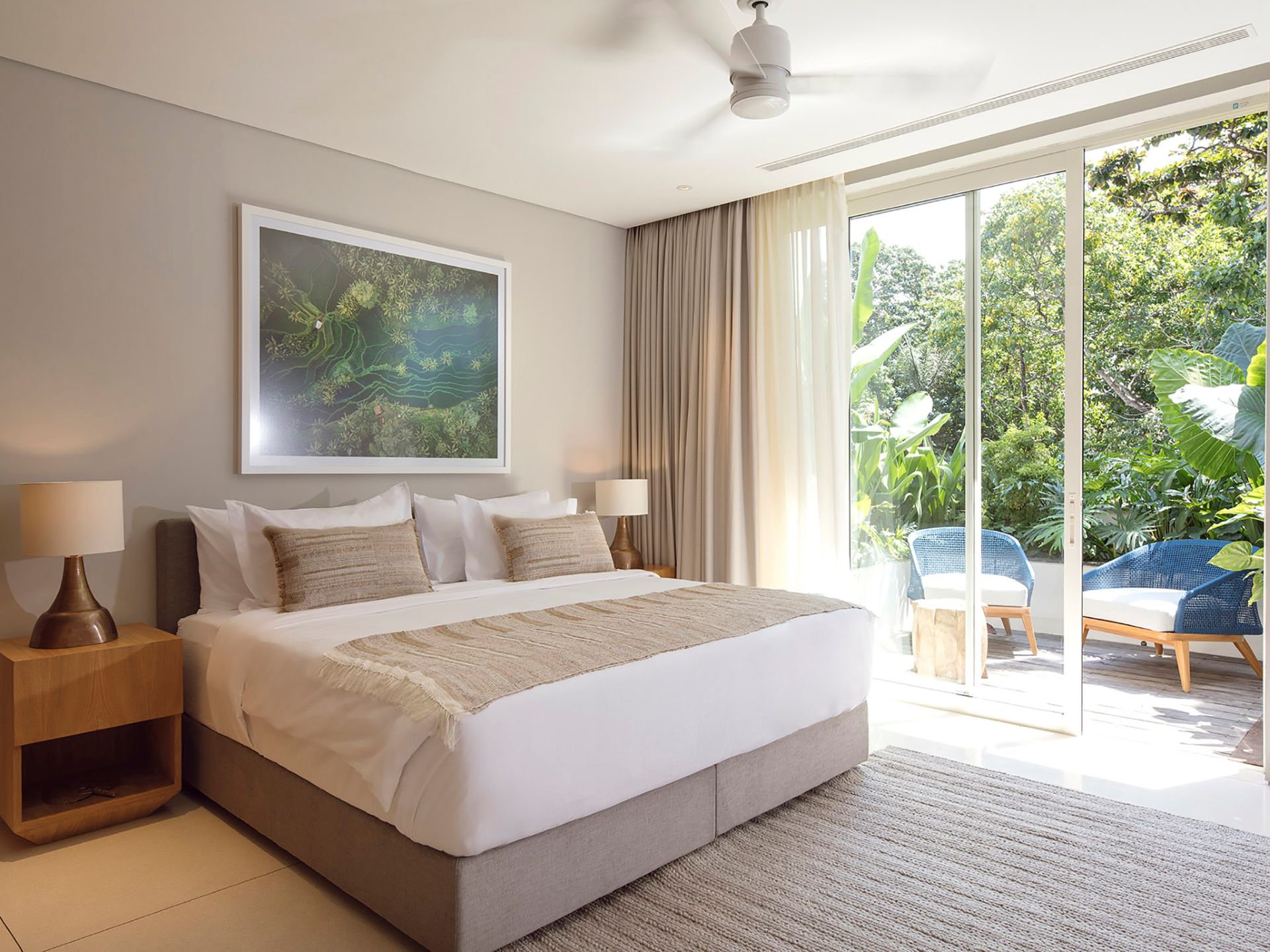 Sea and beach views; King or 2 Single beds; Terrace with seating for 2 shared with Bedroom 3; 38-inch flat screen Smart TV with Transvisions; Walk-in closet; Safety box; Air conditioning; Ceiling fan; Ensuite bathroom with Rain shower & shower, Double vanities, and Toilet; Toiletries; Hair Dryer; Kimonos; Slippers; Umbrellas