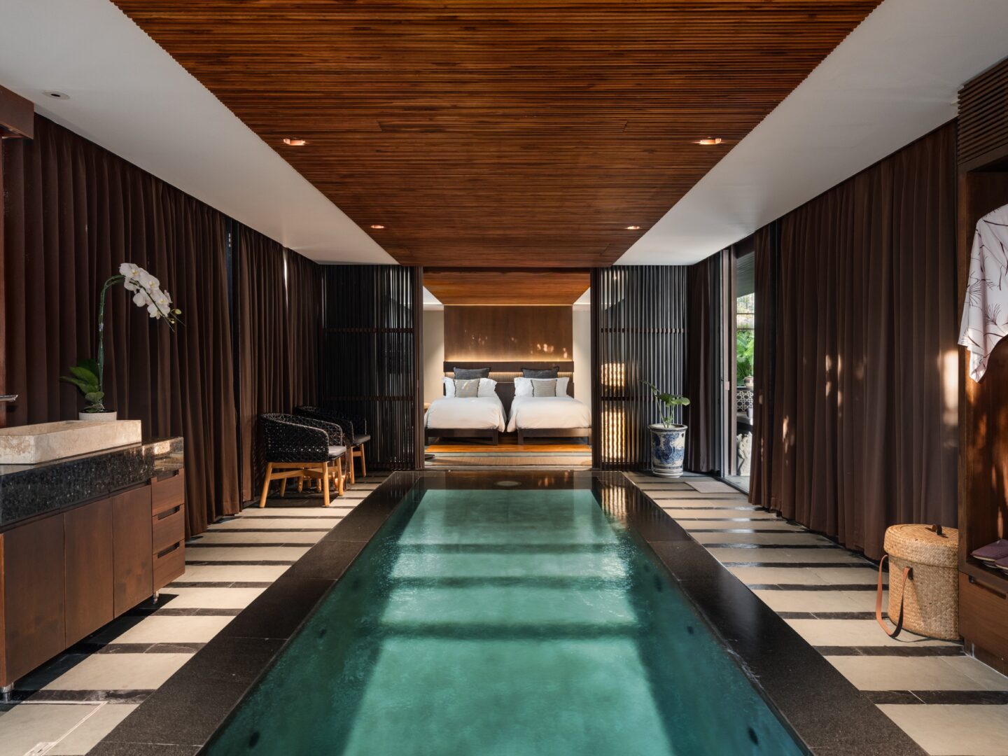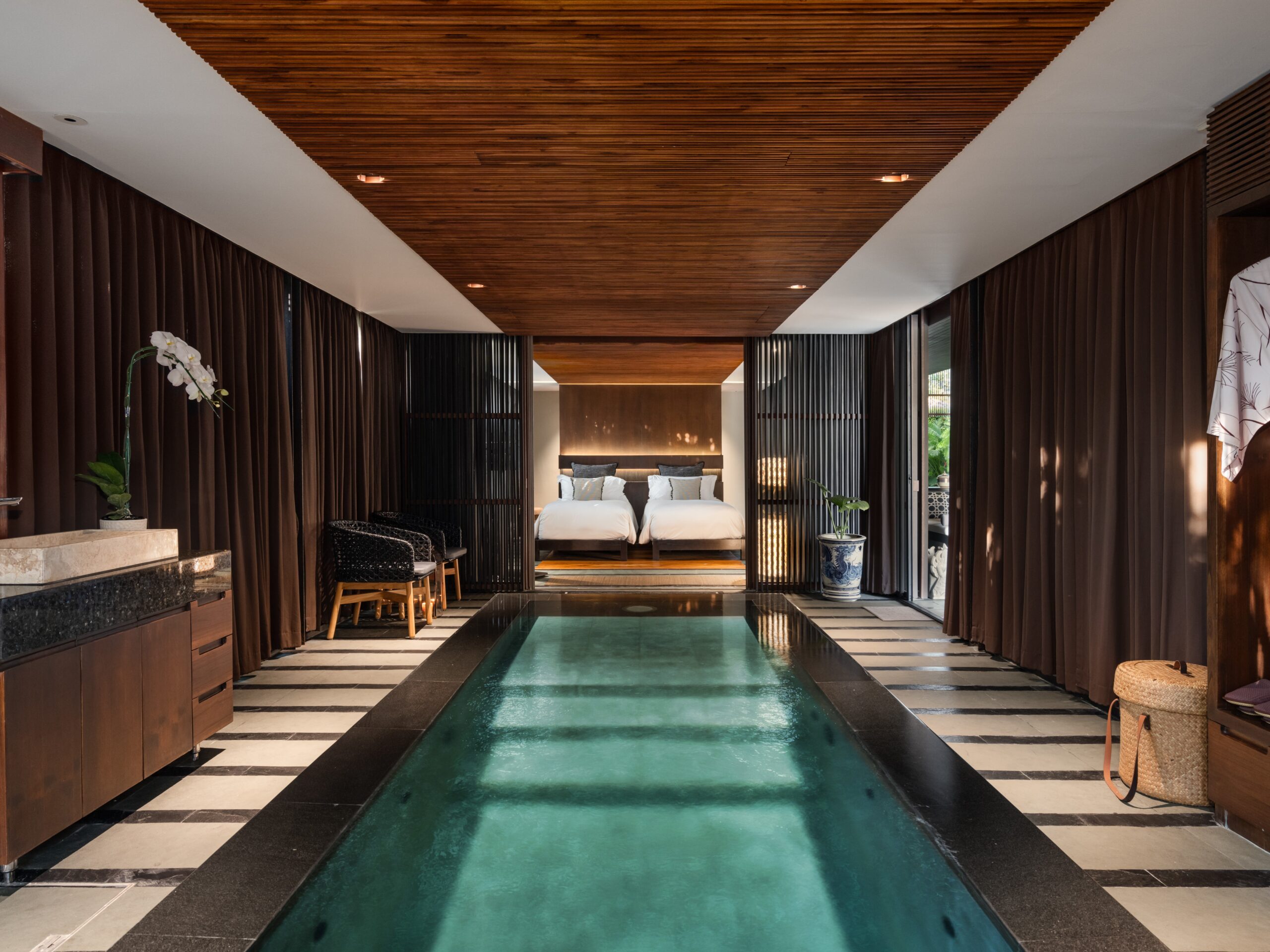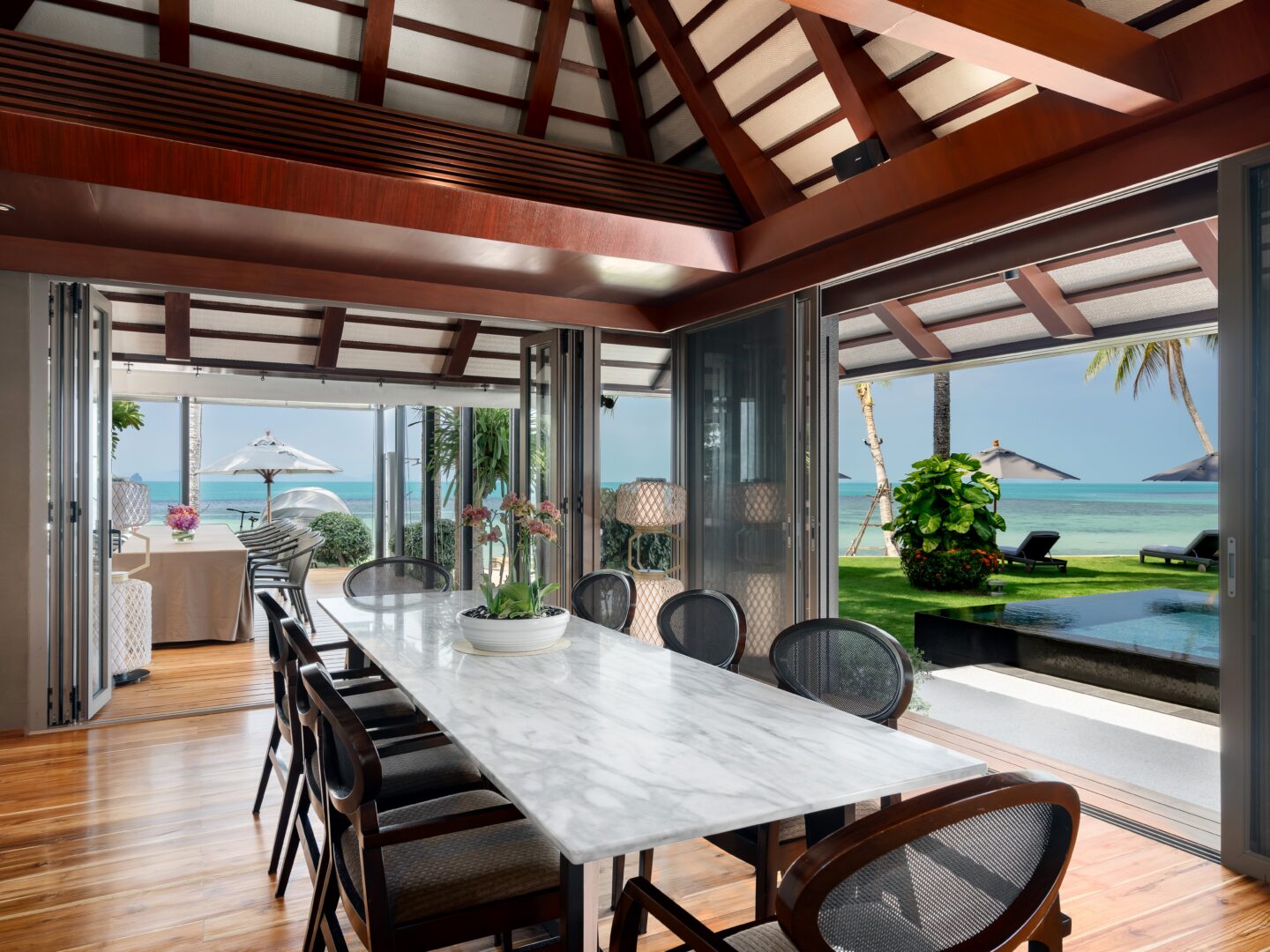 With five exquisitely designed bedrooms, all featuring ensuite bathrooms, Villa Akatsuki is a haven of comfort and sophistication. Three-family suites offer spacious luxury, while the two guest bedrooms exude refined charm. Imagine waking up to the gentle sound of waves, and stepping outside to one of three cascading infinity pools that mirror the sparkling turquoise waters of the Gulf of Thailand. A dedicated kids’ pool ensures even the youngest guests can enjoy the water.