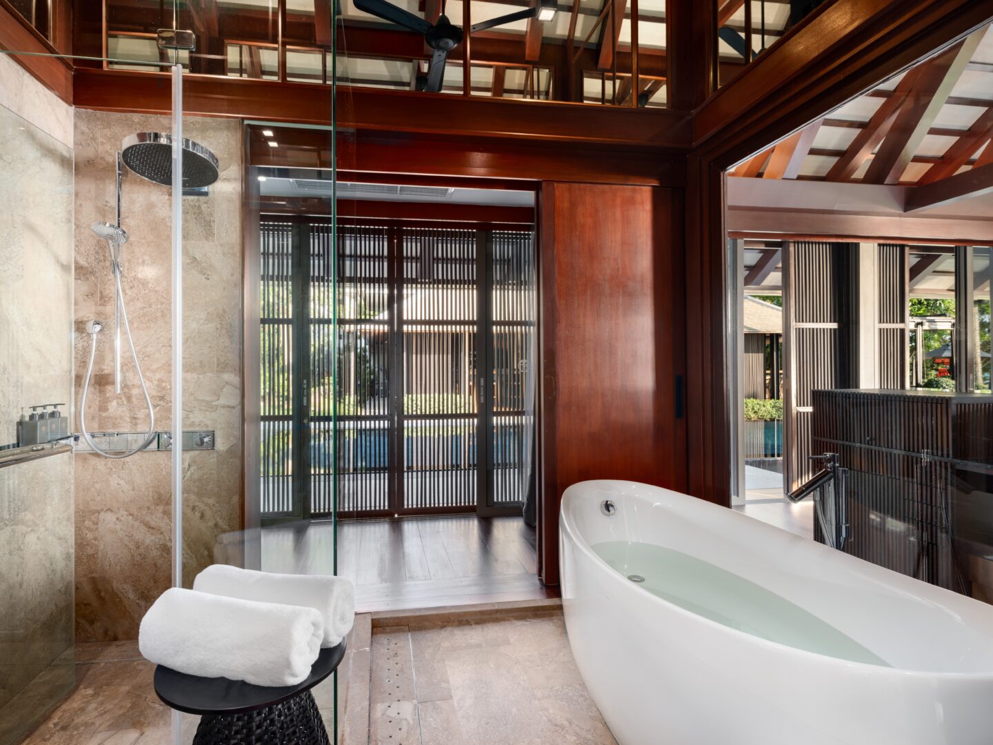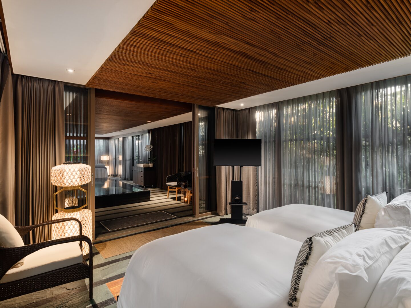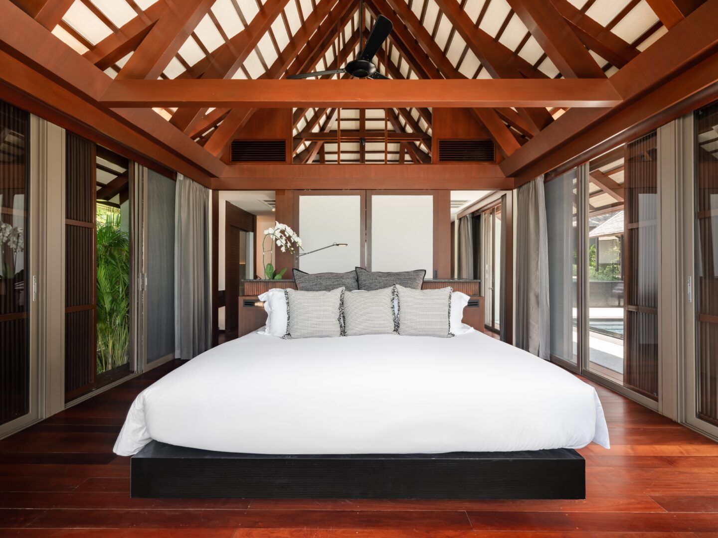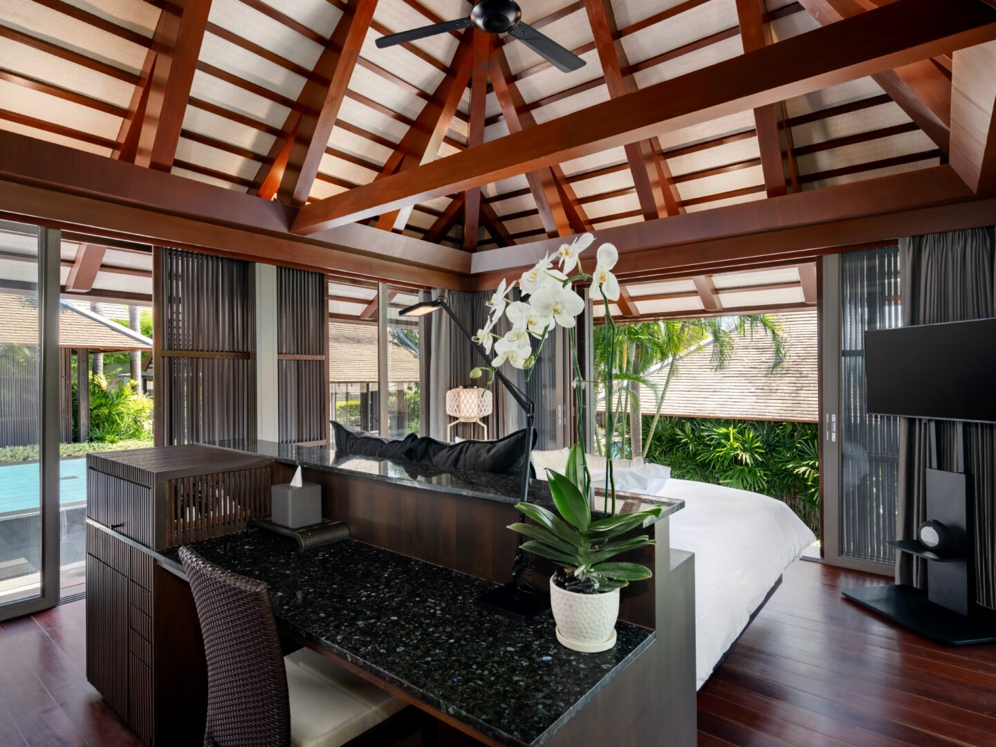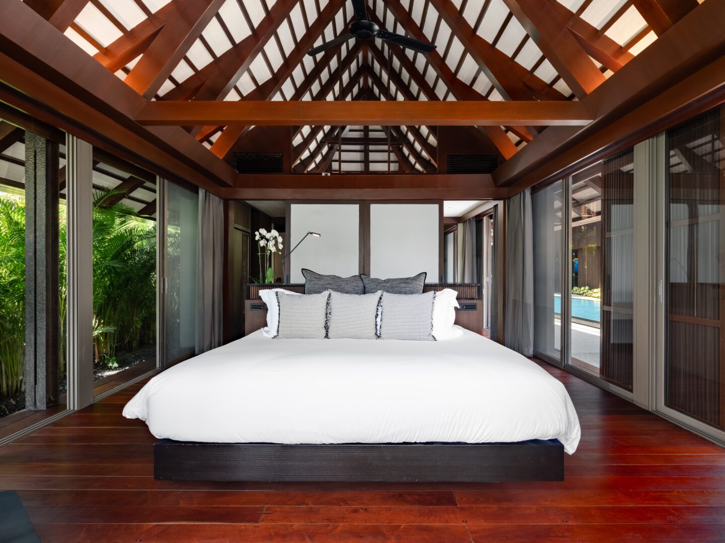 King bed or Two single beds; Pool view; Ensuite bathroom, rain shower, toiletries, bathrobes, bathtub; Satellite/Cable TV; Ceiling fan; Desk