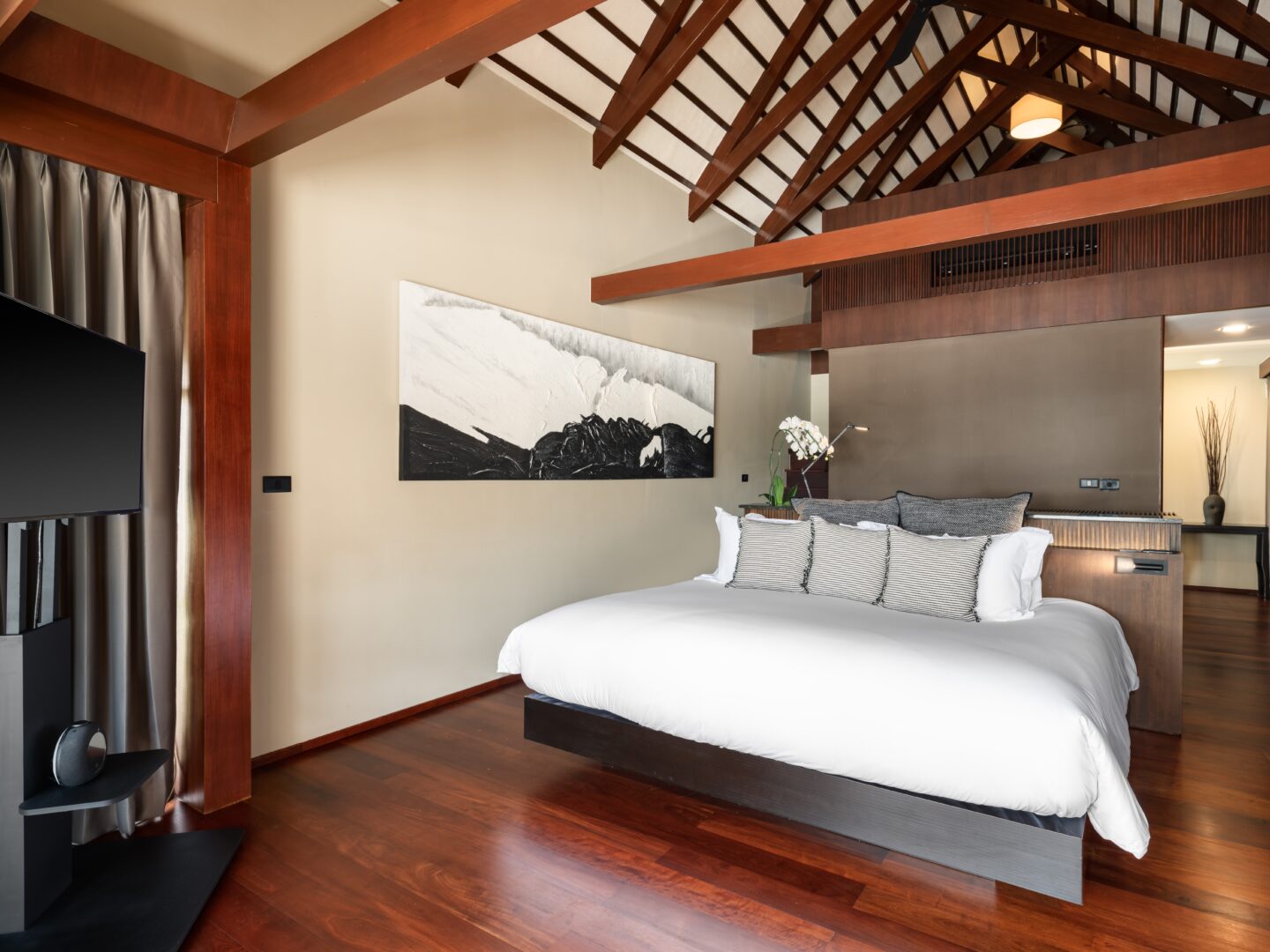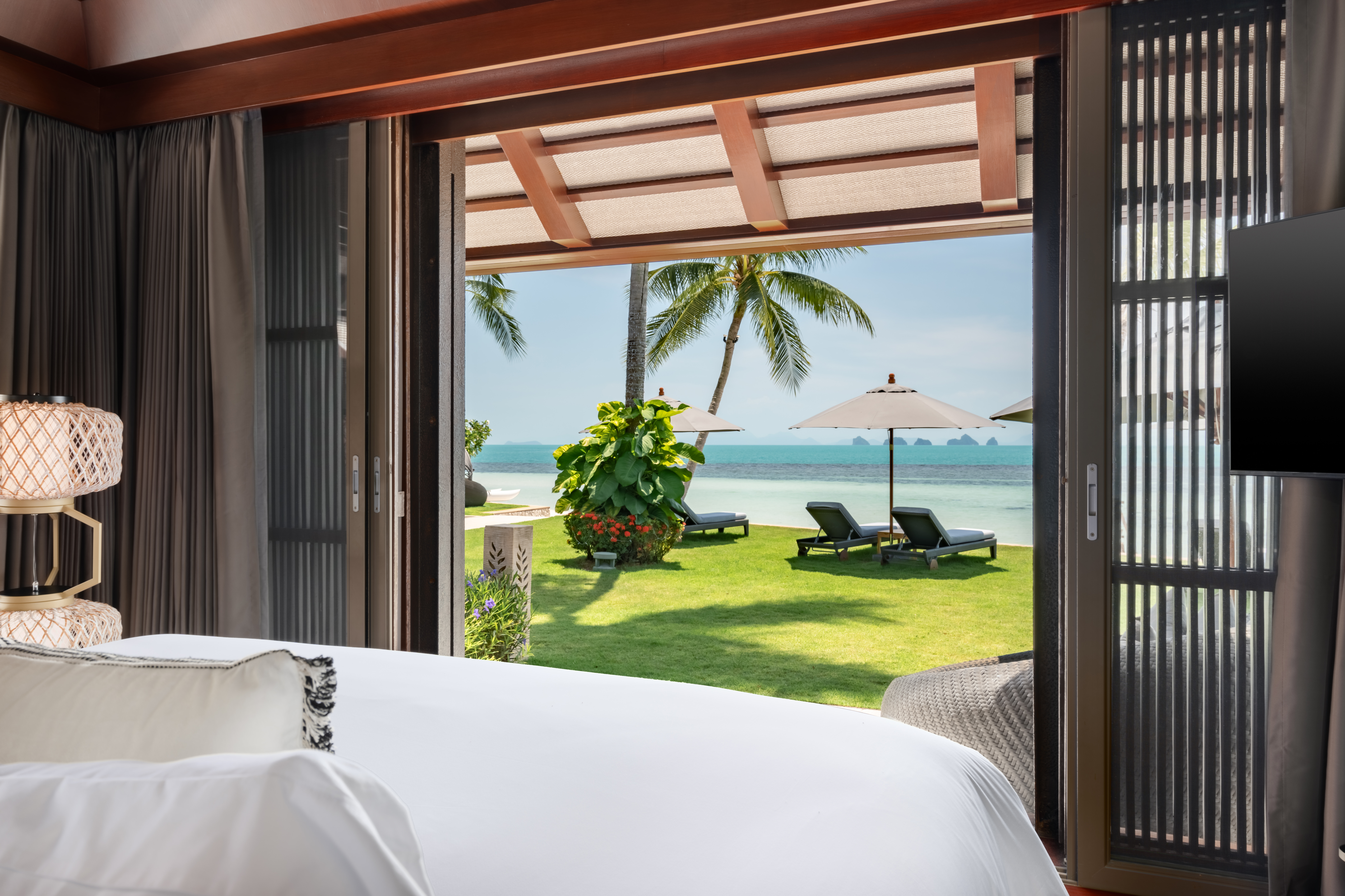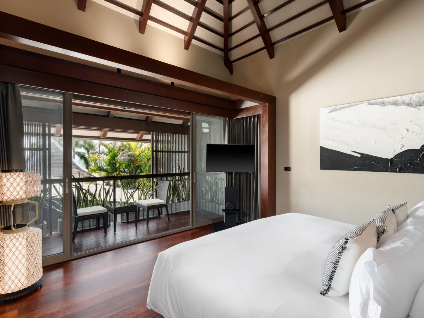 King bed; Beach front; Ensuite bathroom, rain shower, toiletries, bathrobes, bathtub; Satellite/Cable TV; Ceiling fan; Desk