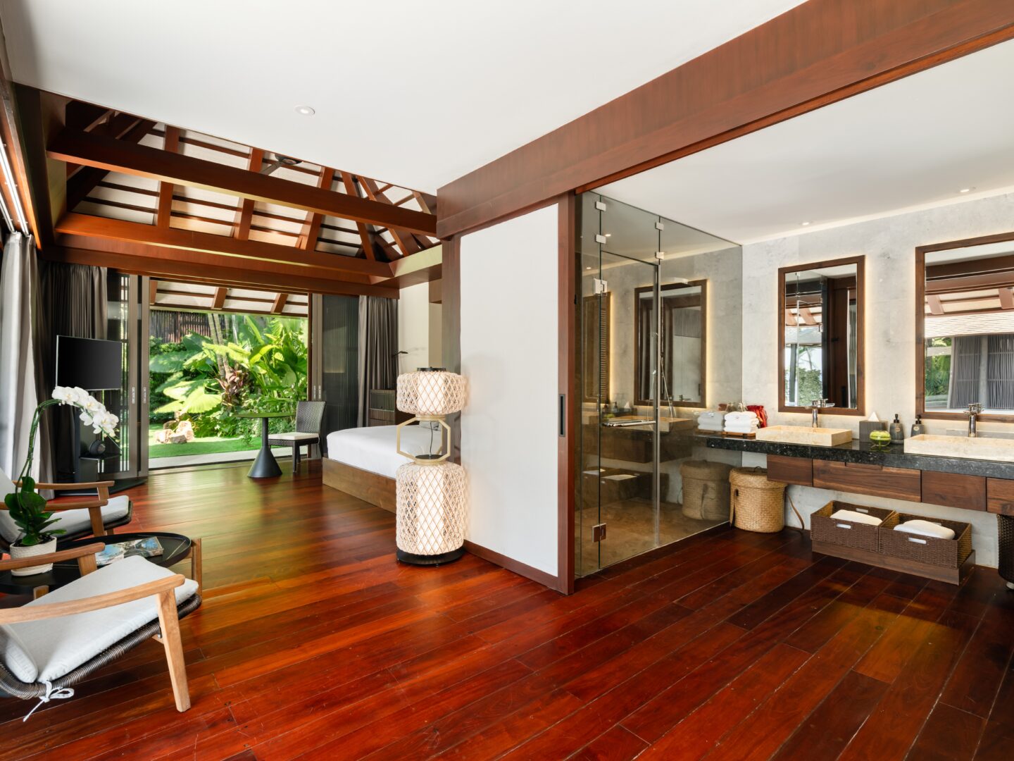 King bed; Garden view; Ensuite bathroom, rain shower, toiletries, bathrobes, bathtub; Satellite/Cable TV; Ceiling fan; Desk