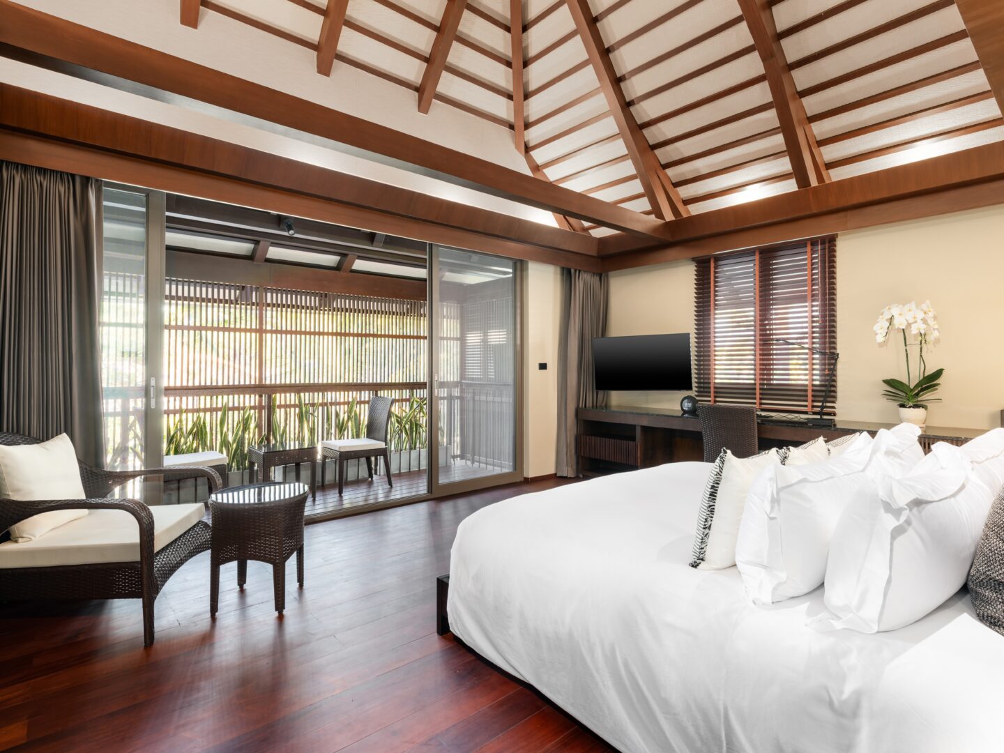 Extra king bed and Two Single beds; Private Balcony; Beachfront; Ensuite bathroom, rain shower, toiletries, bathrobes, bathtub; Satellite/Cable TV; Ceiling fan; Desk