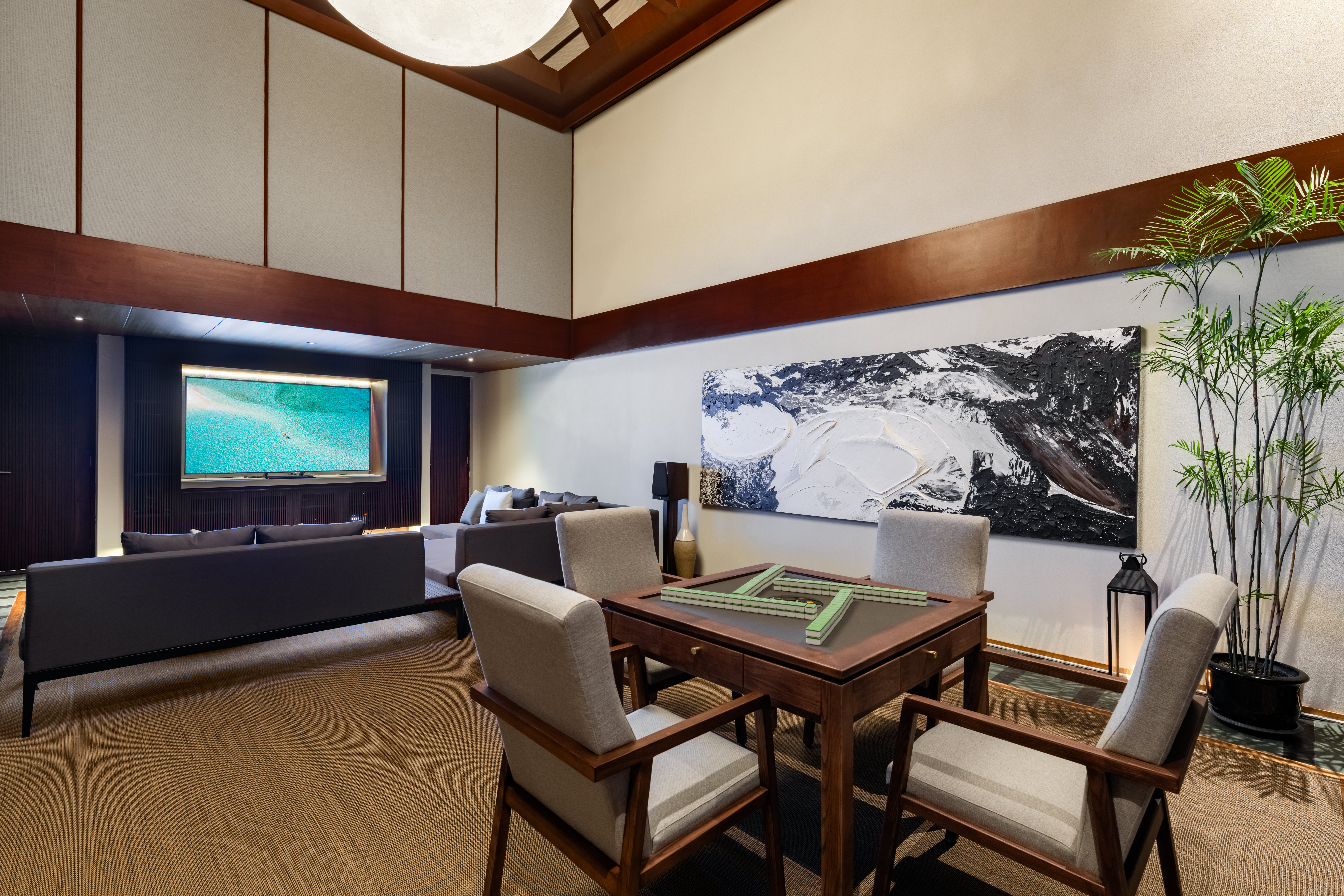 Inside, the villa is a masterpiece of modern luxury. A grand atrium leads to a cozy family room, a state-of-the-art theater room, and a fully equipped American kitchen. Unwind in the fitness and spa room, complete with a six-person Jacuzzi, for ultimate relaxation. High-speed Wi-Fi and Apple sound systems in every common area ensure the perfect soundtrack to your tropical retreat.